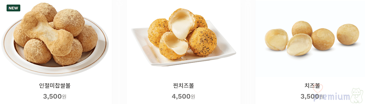 | 찐 치즈볼 | 4,500 | 파마산 치즈 + 체다 치즈 + 모짜렐라 치즈 |