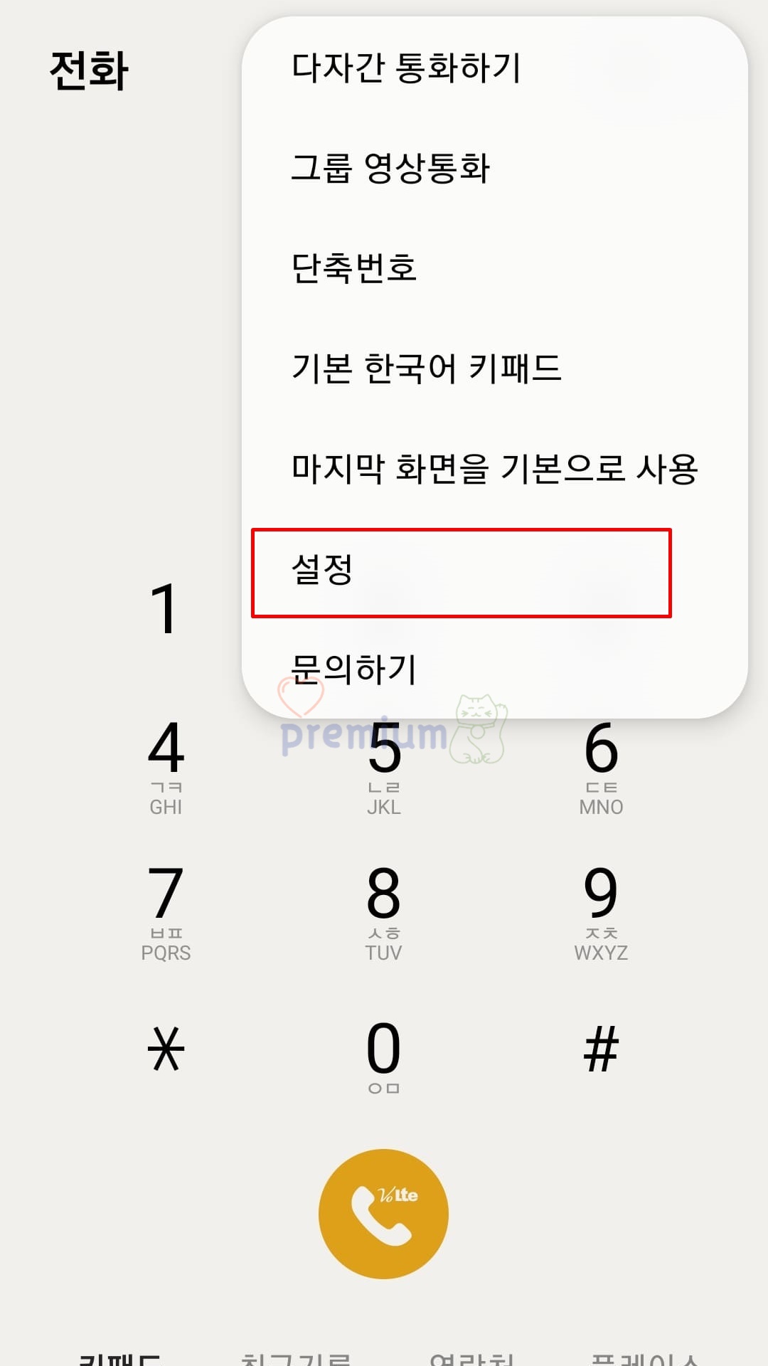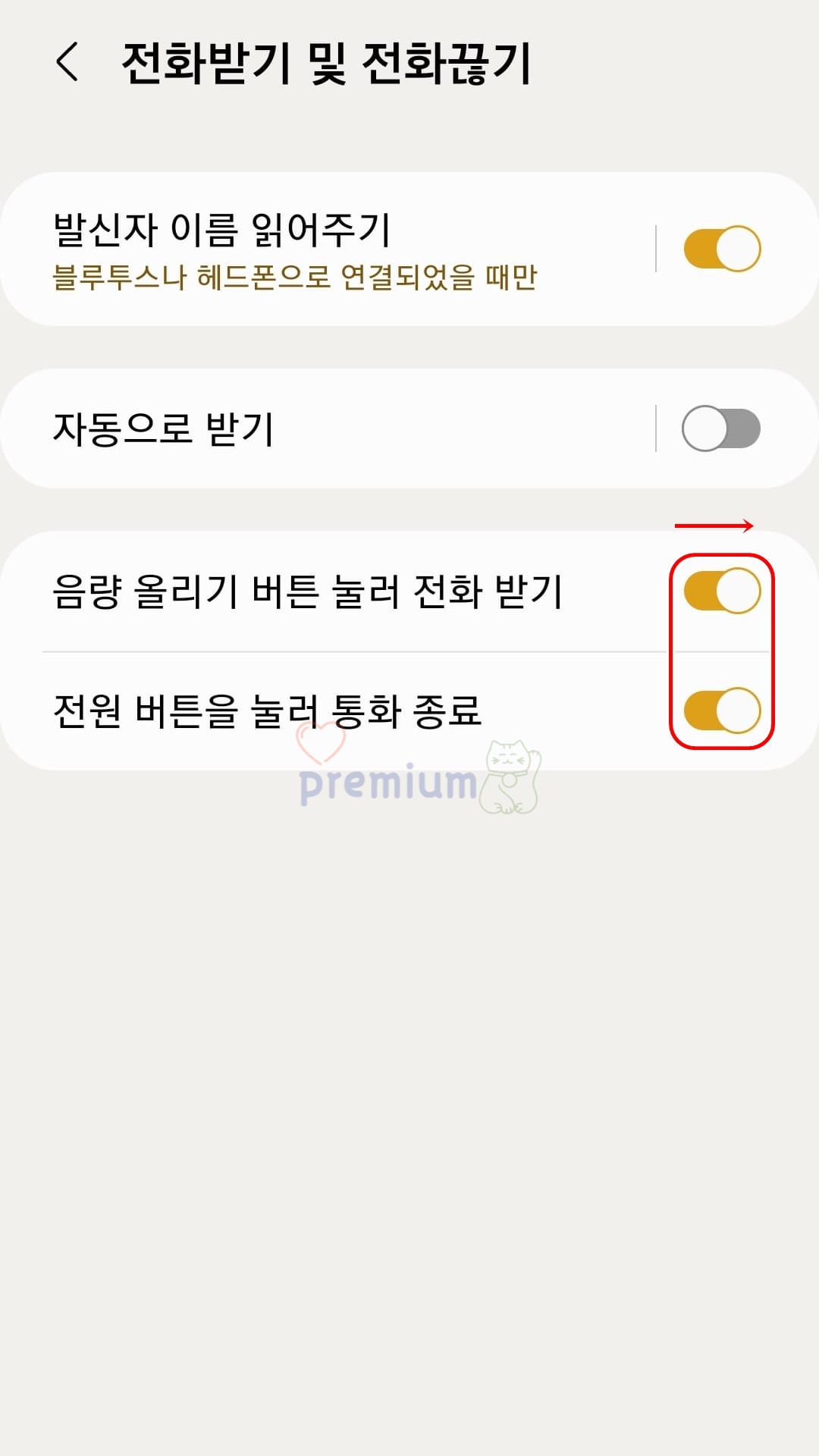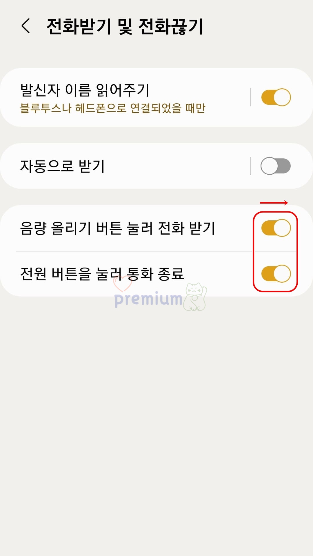 전화 앱 설정에서 버튼으로 통화 종료 및 전화 받기