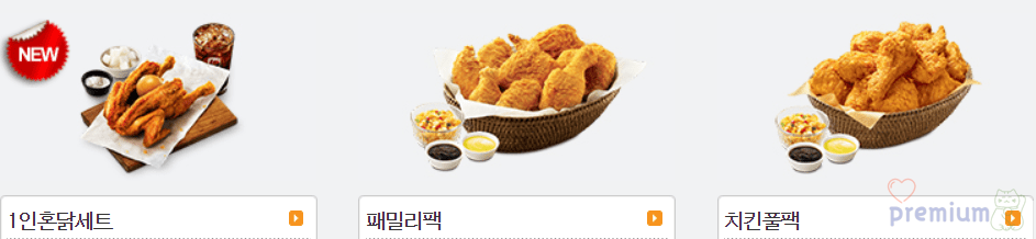 | 패밀리팩 | 14,300원 | 1,594kcal | 치킨 4조각 + 치킨휠레 2조각 + 화이어윙 2조각 + 콘샐러드 + 치킨소스 2 |