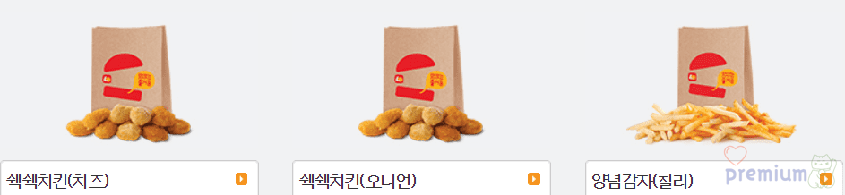 | 치킨너겟 | 2,200원 | 198kcal | 닭안심살 + 닭가슴살 |
