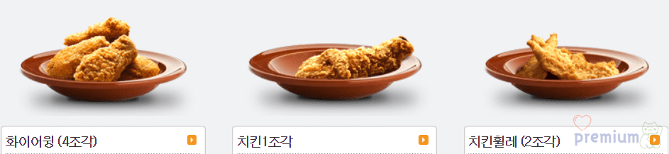 | 치킨휠레 (4조각) | 5,100원 | 366kcal | 닭안심살로 만든 순살 |