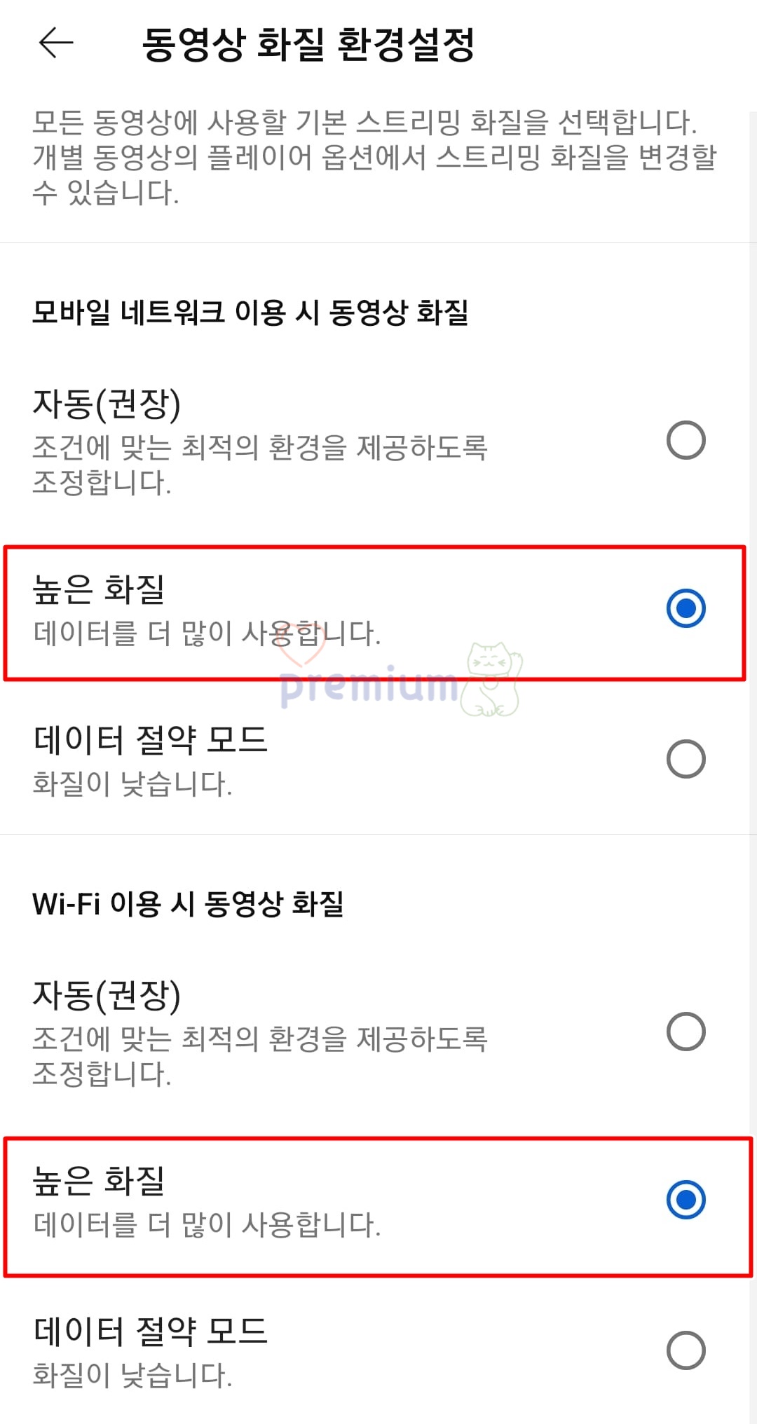 모바일 네트워크 이용 시 화질과 Wi-Fi 이용 시 화질 모두 높은 화질로 설정하시면 됩니다.