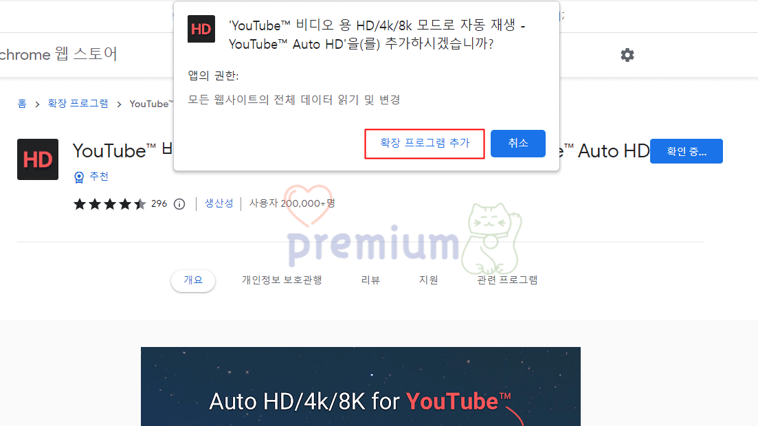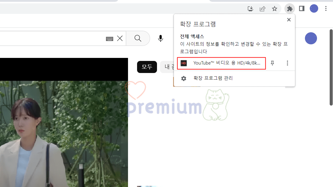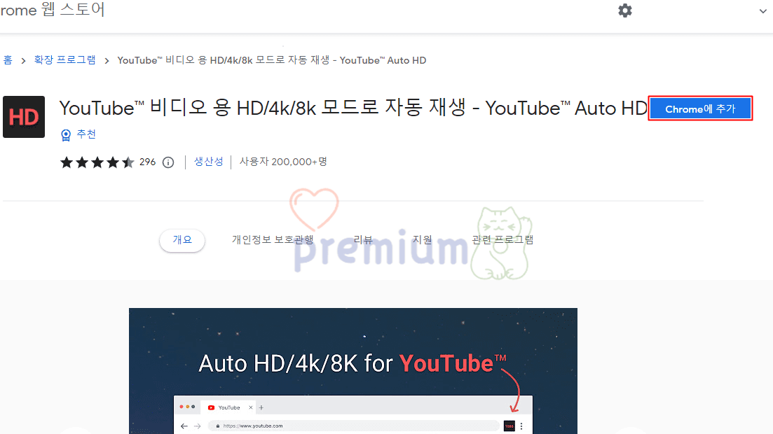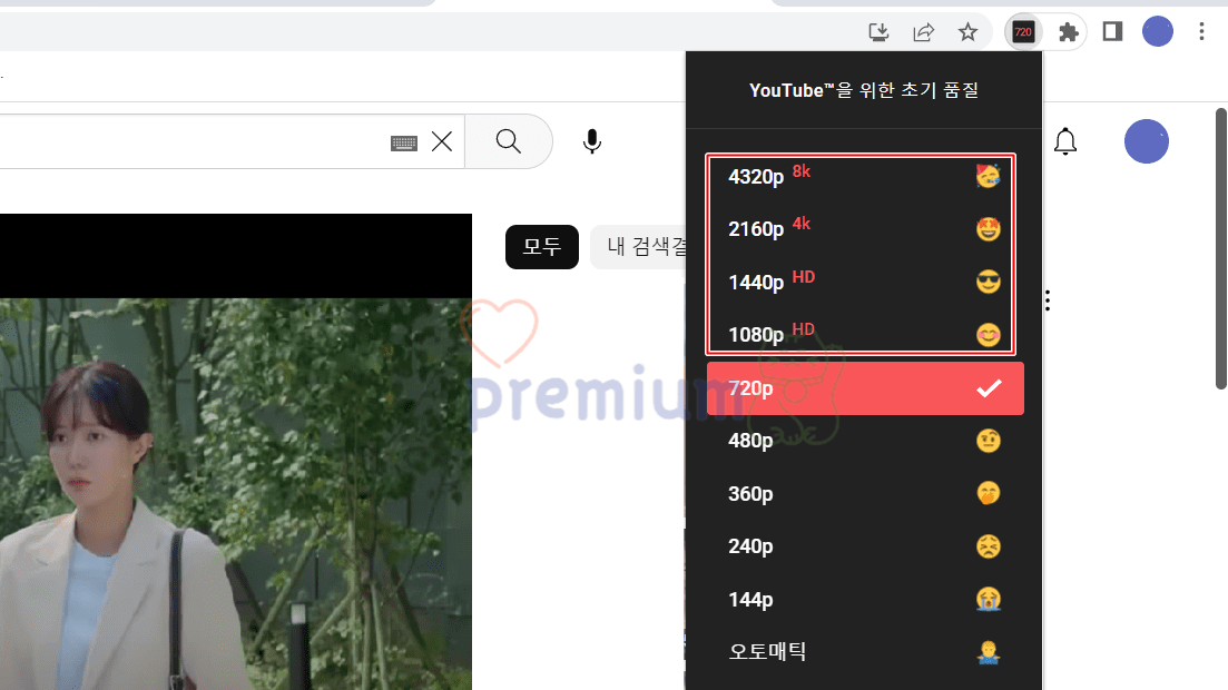 1. 유튜브 확장 프로그램 (https://chrome.google.com/webstore/detail/auto-hd4k8k-for-youtube-y/fjdmkanbdloodhegphphhklnjfngoffa?hl=ko)을 실행합니다.