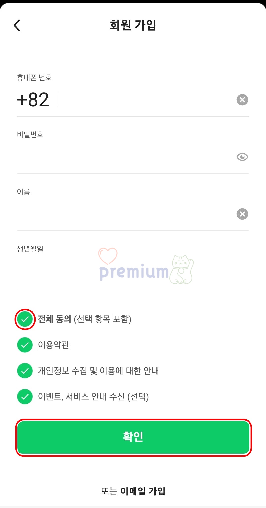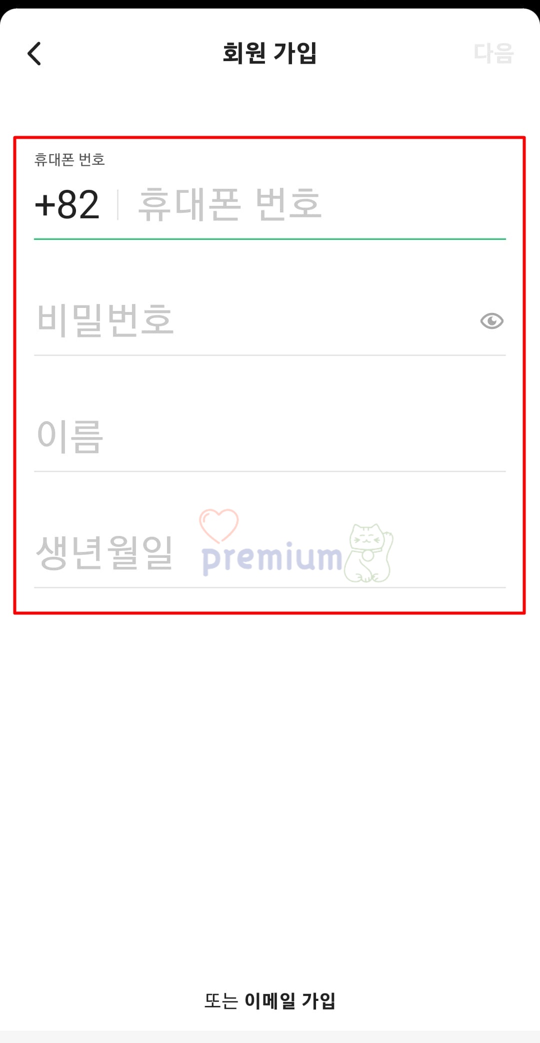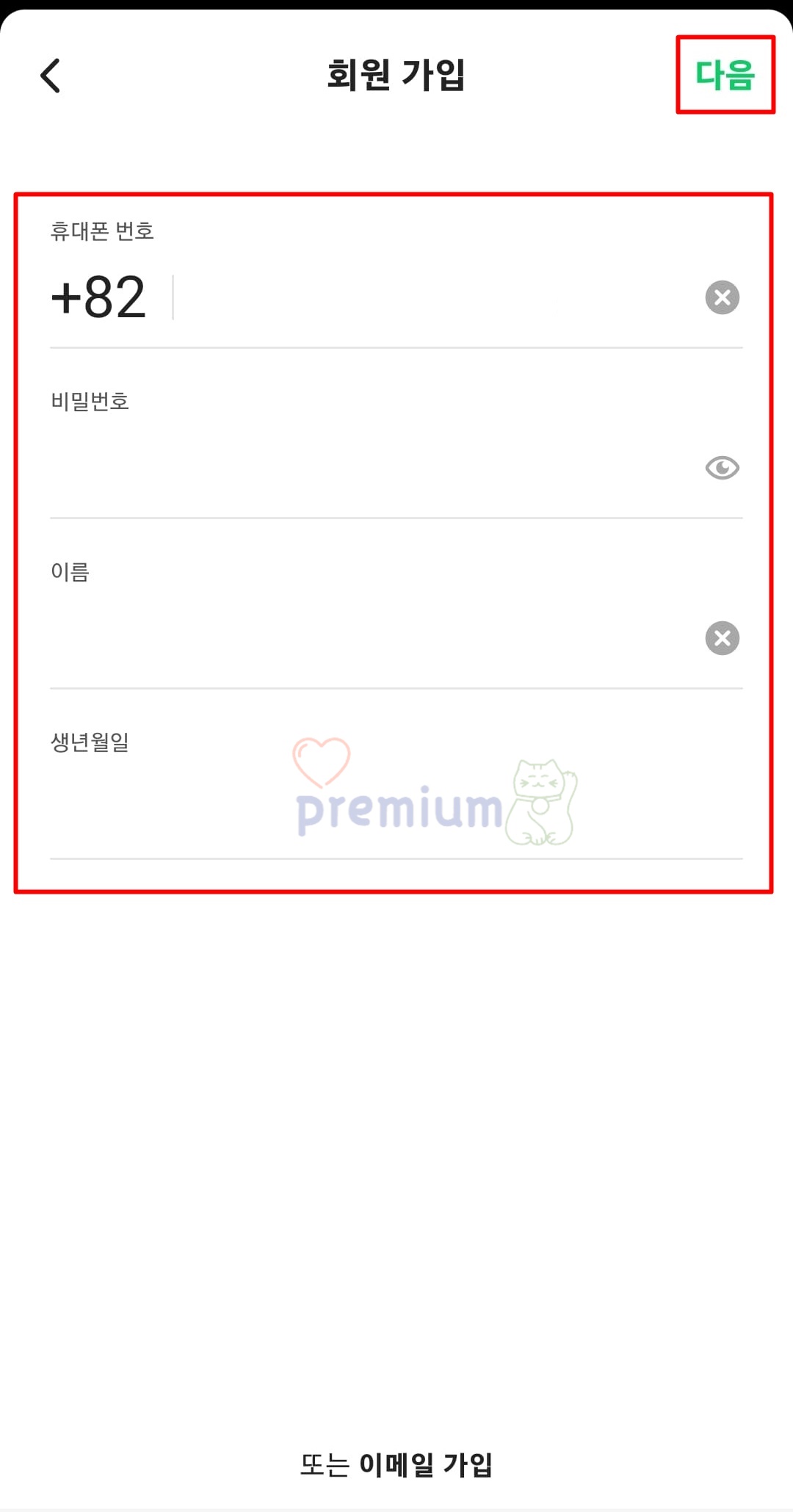 - 휴대폰 번호 또는 이메일로 가입 : 휴대폰 번호와 설정하고 싶은 비밀번호, 이름, 생년월일을 입력합니다.