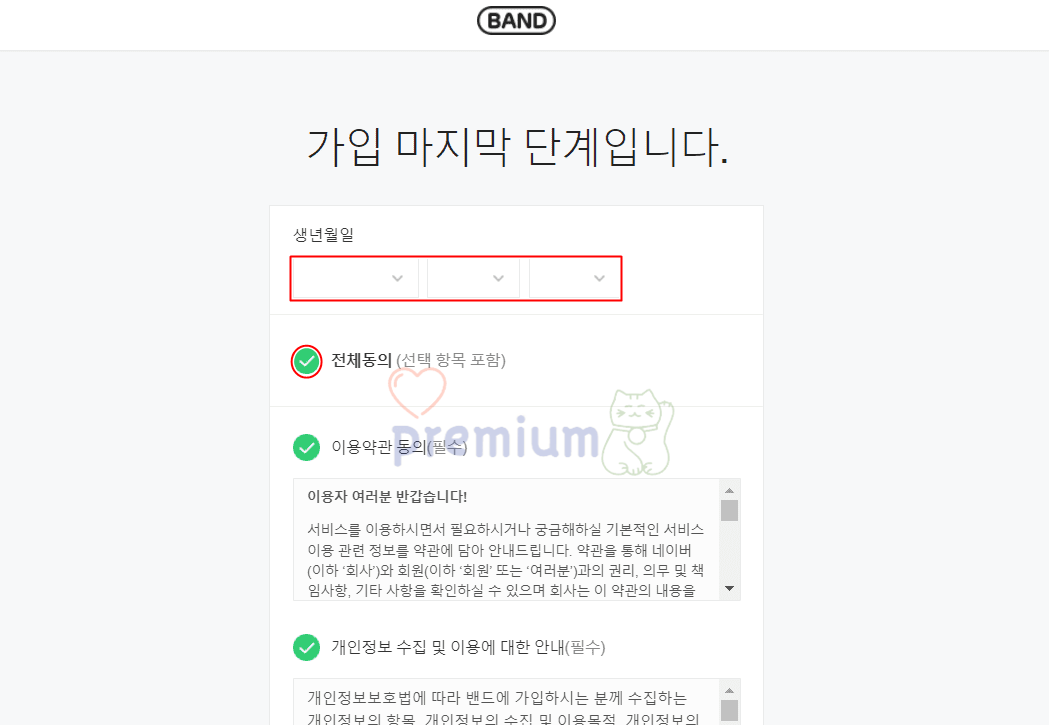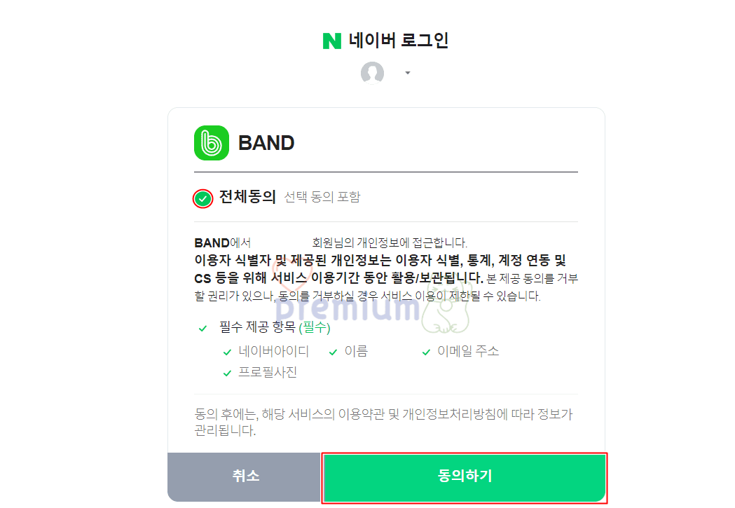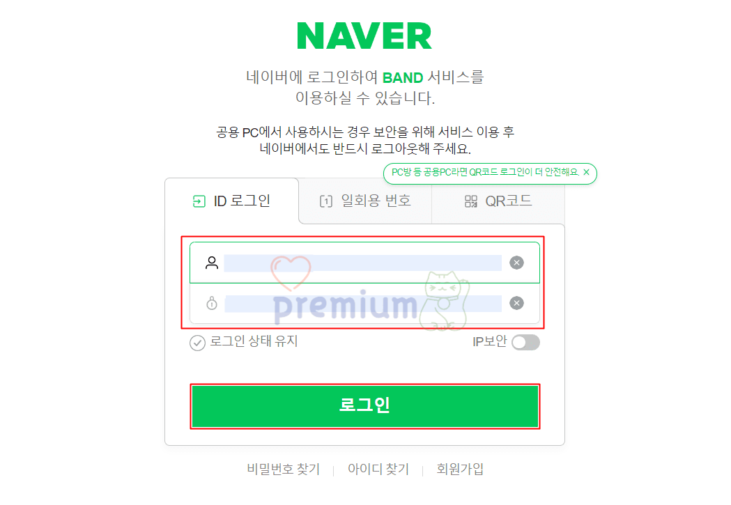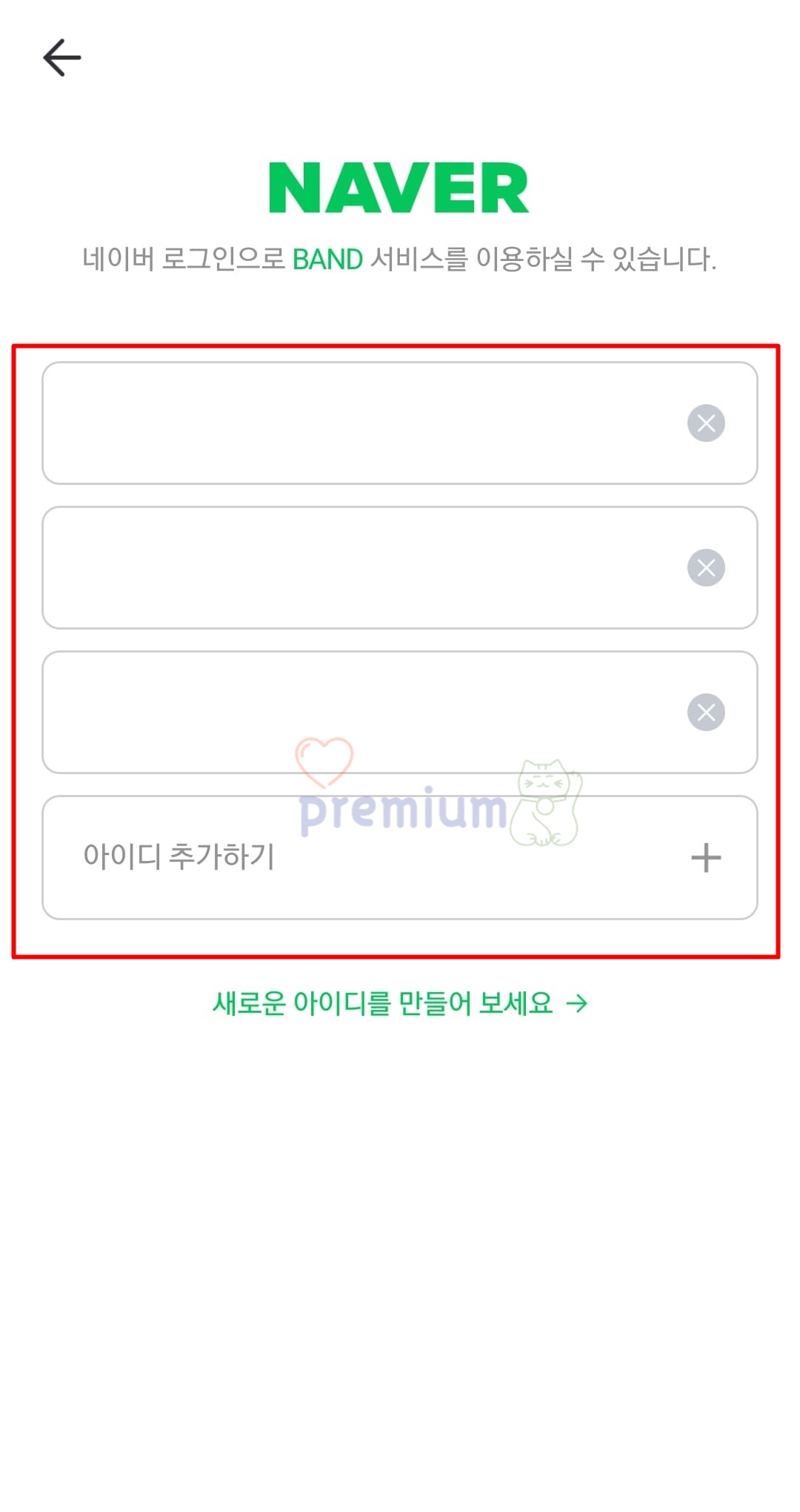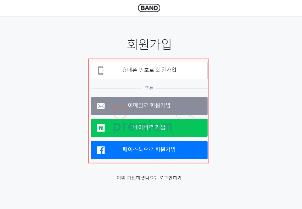 - 네이버로 가입 : 네이버밴드에 가입하고 싶은 네이버 아이디와 비밀번호를 입력 또는 선택합니다.