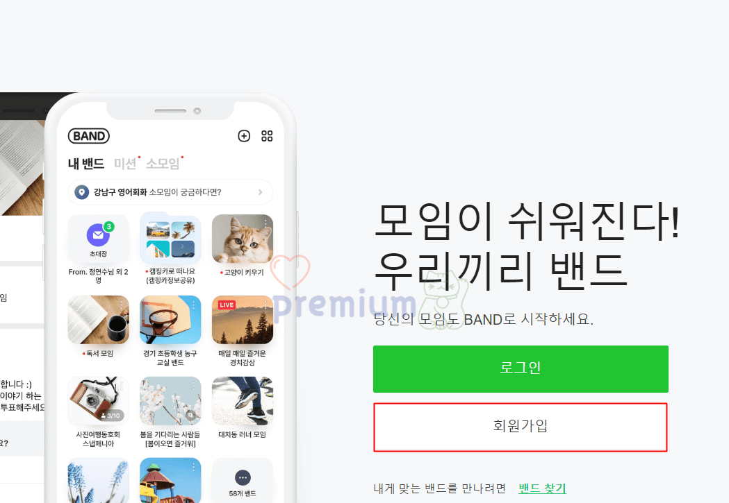 안녕하세요. 다양한 정보를 소개해주는 프리미엄IT입니다. 이번 주제는 네이버밴드 가입 방법에 대해서 알려드리고자 합니다. 네이버밴드는 2012년 8월에 출시한 네이버에서 제작한 SNS입니다. 네이버밴드는 동아리나 학교 친목, 또는 회사에서 사용하기도 하고, 등산, 동호회 등 각종 모임으로 사용합니다. 예전에는 네이버밴드가 한창 인지도가 많았지만 요즘에는 인스타그램이나 카카오톡 등 다양한 SNS이 활발해지다 보니 예전에 비해서 요즘에는 네이버밴드의 인지도가 좀 떨어진 편이더군요. 더군다나 젊은 분들은 인스타그램, 카카오톡, 페이스북으로도 SNS을 할 수 있다 보니 젊은 분들보다는 특히 나이 드신 분들은 꾸준히 네이버밴드를 사용하고 계십니다. 그리고 네이버밴드는 앱과 PC로도 사용할 수 있는데요. 혹시라도 네이버밴드를 사용하고 싶은데 가입하는 방법을 모르시는 분들은 아래의 방법을 참고하시길 바랍니다