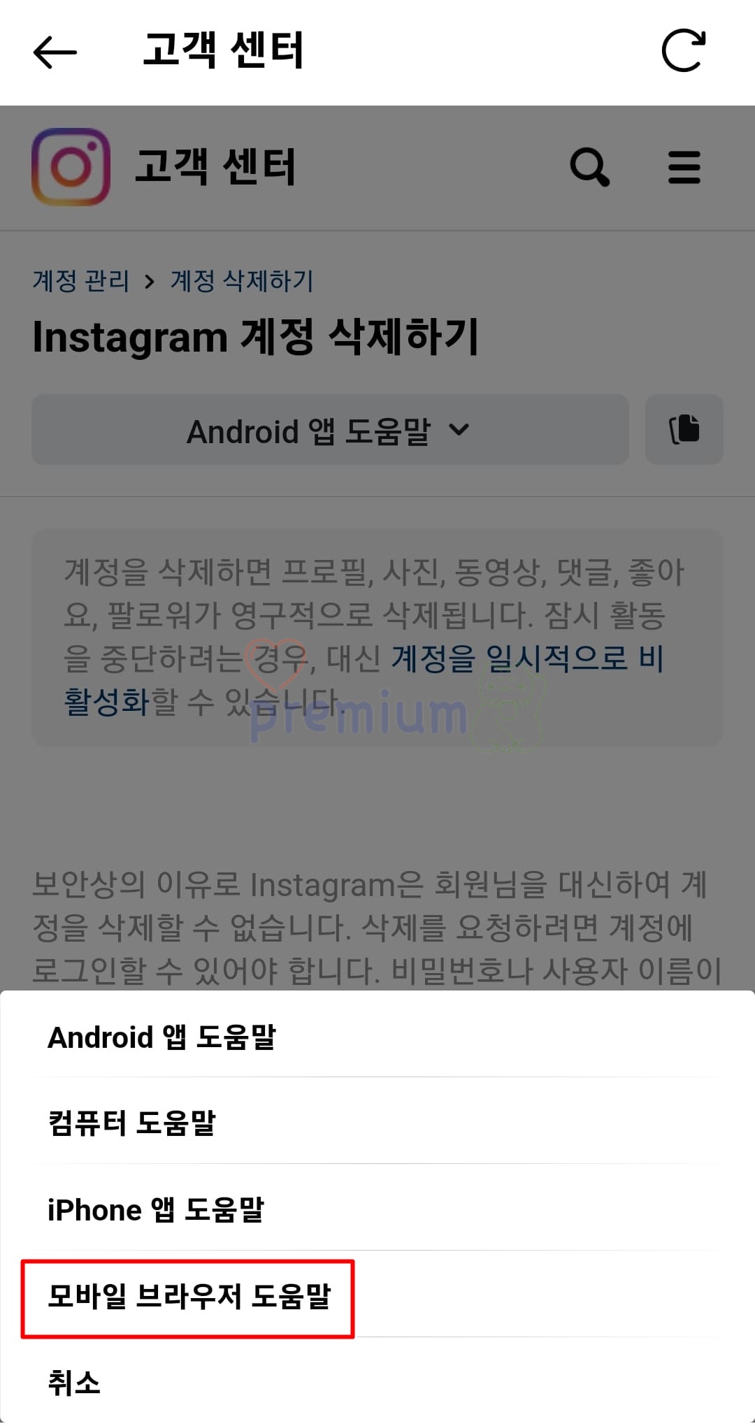 모바일에서 계정 삭제 시, 모바일 브라우저 도움말에서 계정을 삭제하실 수 있습니다.