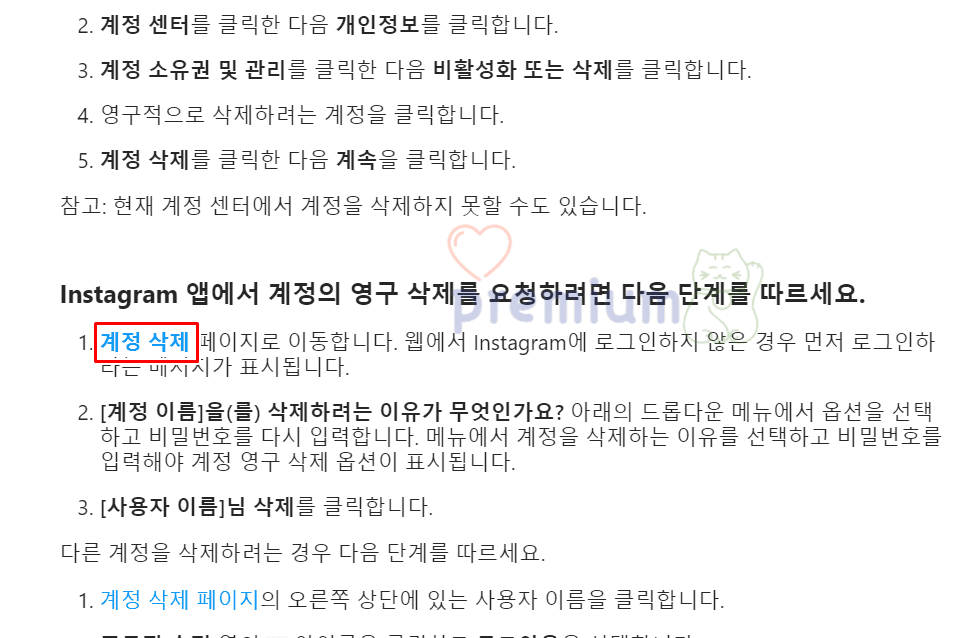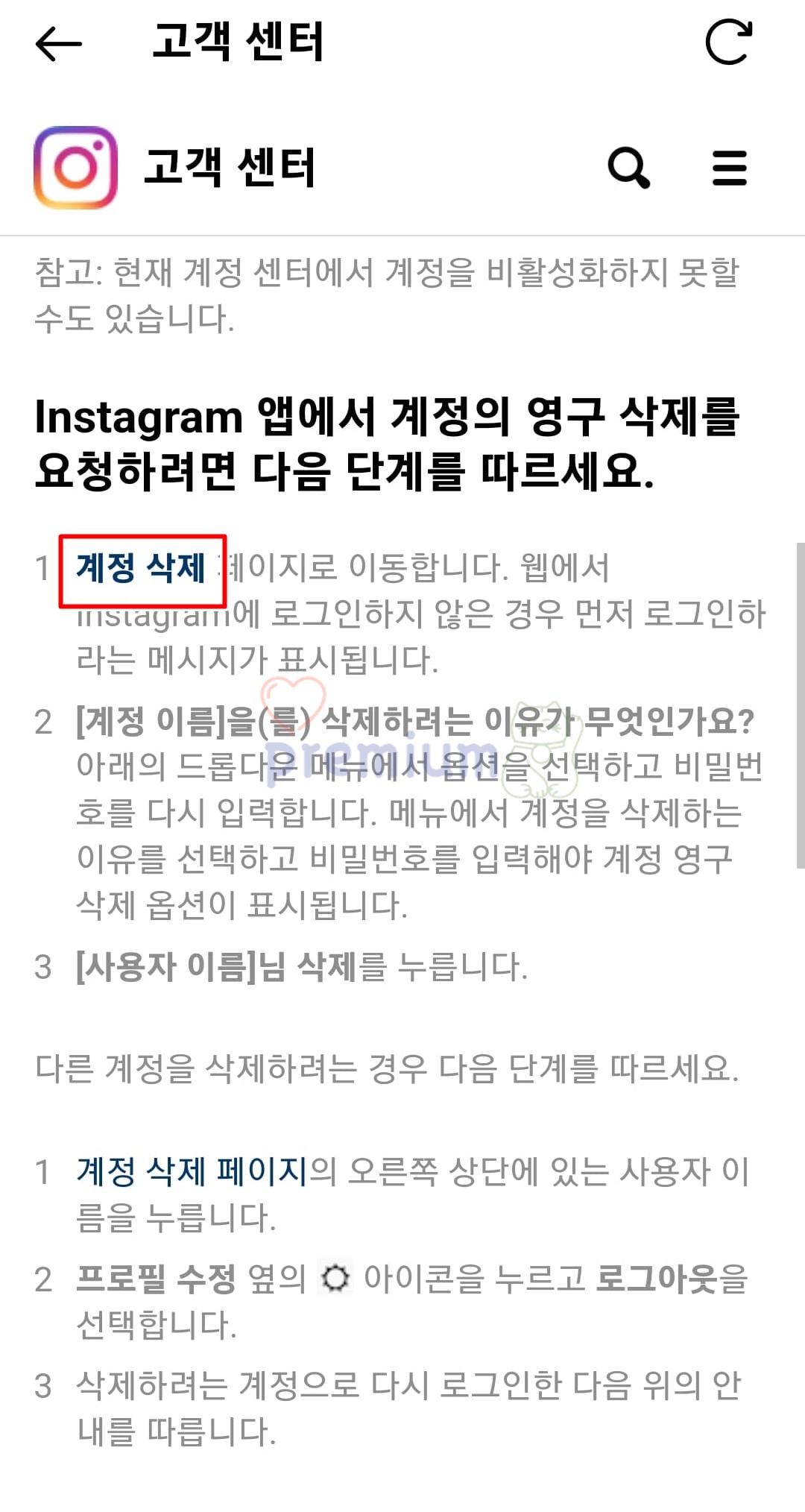 안녕하세요. 다양한 정보를 소개해주는 프리미엄IT입니다. 이번 주제는 인스타그램 계정 삭제 방법에 대해서 알려드리고자 합니다. 가장 많이 사용하고 있는 SNS 중 하나가 바로 인스타그램입니다. 인스타는 다른 사람들과 소통할 수 있고, 다른 사람들의 일상, 공유, 홍보 등 다양한 활동을 할 수 있어서 즐겨하시는 분들이 많은 반면, 재미없어하시는 분들도 많습니다. 또는 재미뿐만 아니라 인스타로 하루종일 시간을 뺏는 것 같아서 끊어보려고(?) 계정을 삭제하려고도 하죠. 하지만 인스타그램은 계정 삭제 버튼이 숨겨져 있어서 삭제하기가 어려워 그대로 내버려 두는 경우가 많은데요. 저는 사실 인스타그램을 잘 사용하지 않는 편이라 계정 삭제를 할까 하다가 혹시 몰라서 그대로 유지하고 있습니다. 오늘은 계정 삭제를 원하시는 분들을 위해서 계정을 삭제해보려고 합니다. 혹시라도 계정 삭제 방법을 모르시는 분들은 아래의 방법을 참고하시기 바랍니다.