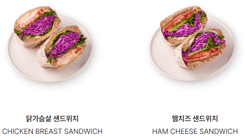| 닭가슴살 샌드위치 | 5,900 | 로메인 + 양상추 + 적채 + 수비드 닭가슴살 + 토마토 + 치즈 |