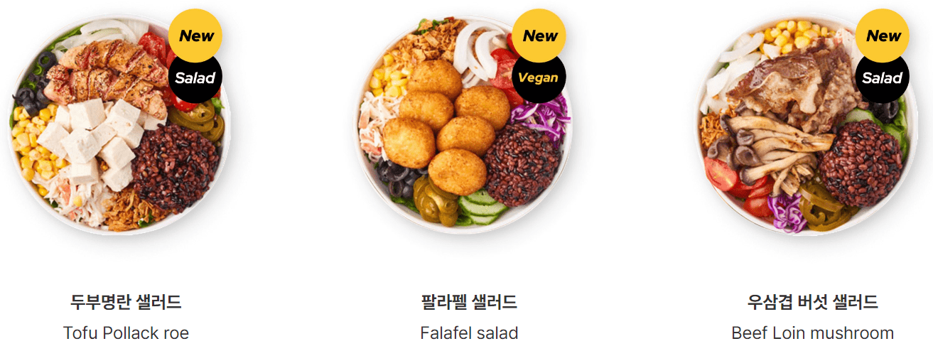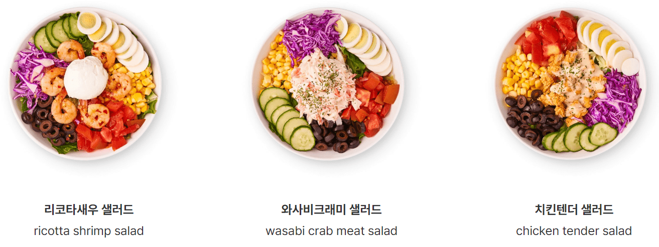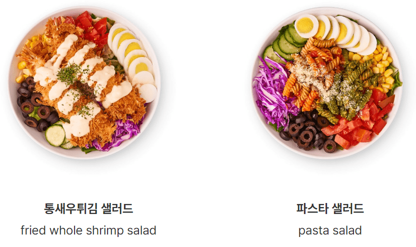 | 파스타 샐러드 | 7,400 | 215 | 파스타 + 로메인 + 양상추 + 적채 + 오이 + 계란 + 옥수수 + 올리브 + 토마토 + 바질페스토 + 칠리 소스 + 파마산 치즈 ★ 스파이시마요 드레싱 |
