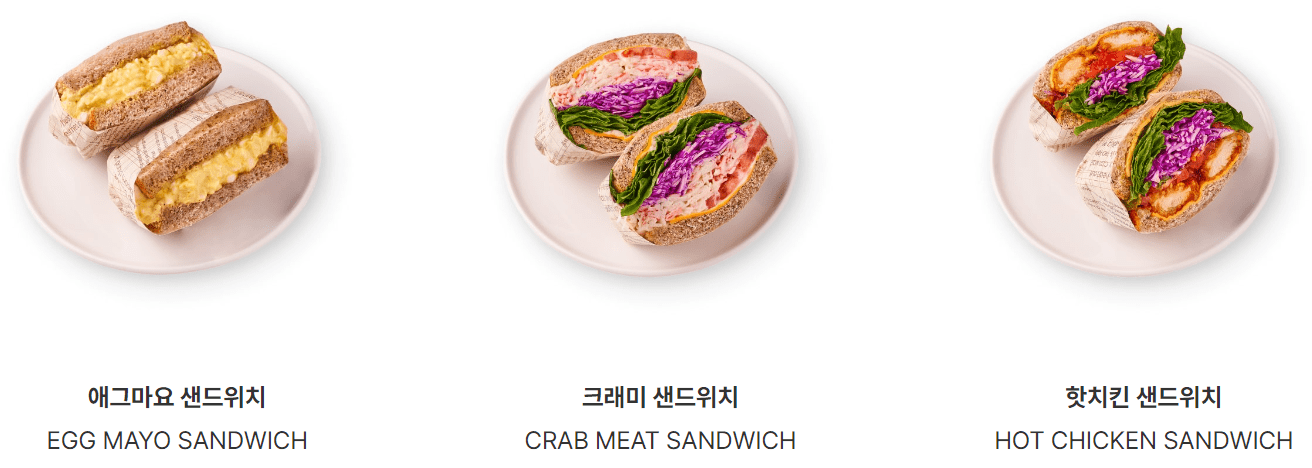 | 크래미 샌드위치 | 6,900 | 로메인 + 양상추 + 적채 + 크래미 + 토마토 + 치즈 + 어니언 소스 |