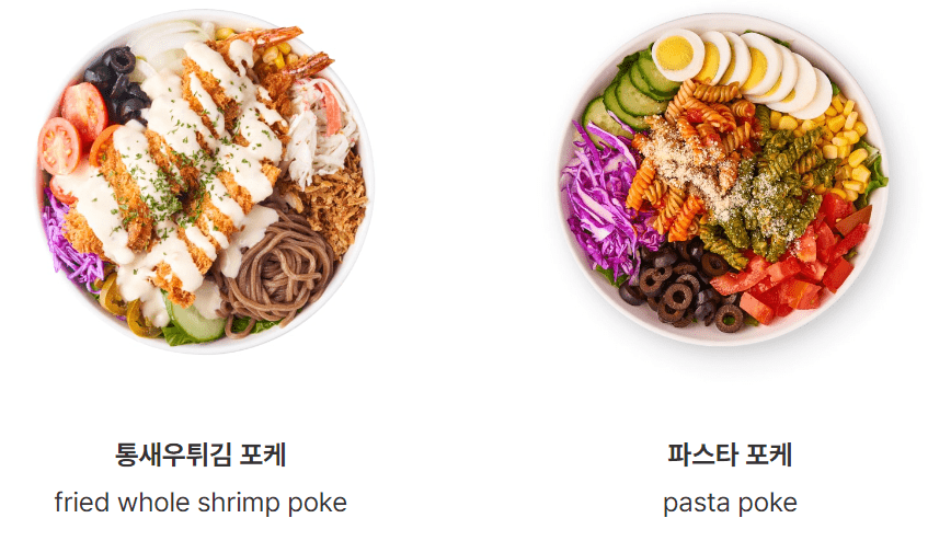 | 통새우튀김 포케 | 9,900 | 315 | 통새우 + 로메인 + 양상추 + 적채 + 오이 + 양파 + 토마토 + 할라피뇨 + 크래미 + 올리브 + 흑미보리밥 or 메밀면 ★ 갈릭치즈 드레싱 |