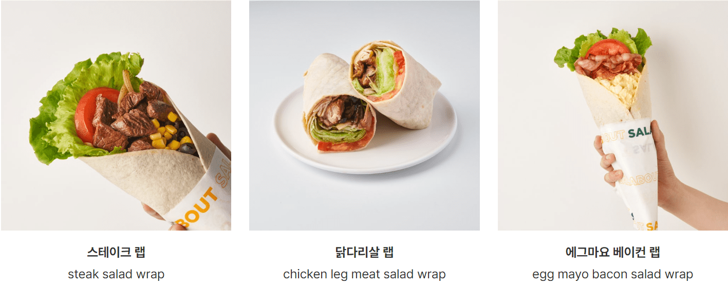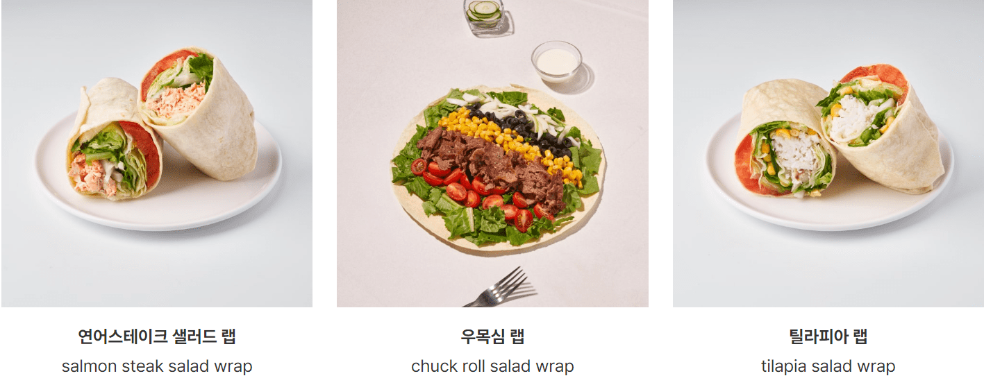 | 연어스테이크 샐러드 랩 | 13,900 | 560 | 적채 + 또띠아 ★ 어니언 드레싱 |