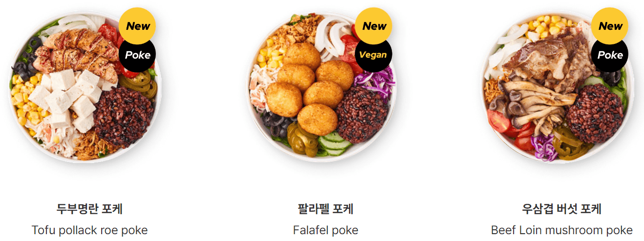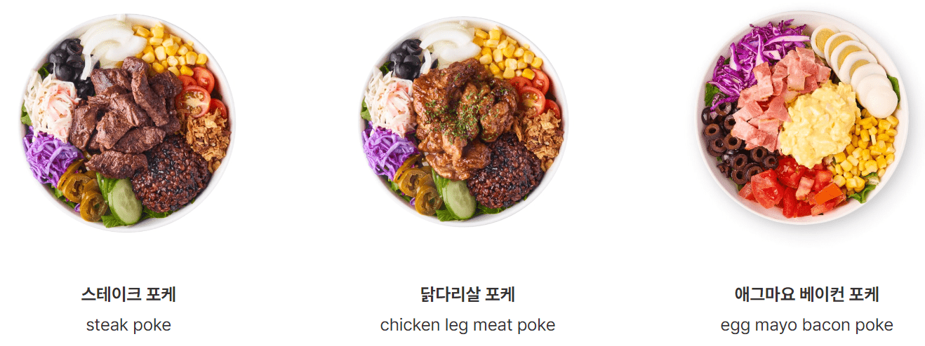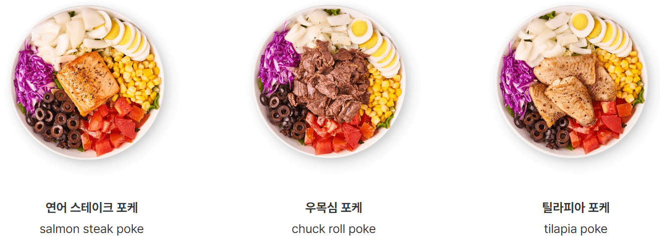 | 스테이크 포케 | 11,900 | 405 | 부채살 + 로메인 + 양상추 + 적채 + 오이 + 양파 + 토마토 + 할라피뇨 + 크래미 + 올리브 + 흑미보리밥 or 메밀면 ★ 오리엔탈 드레싱 |
