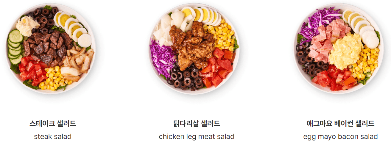 | 닭다리살 샐러드 | 9,900 | 450 | 닭다리살 + 로메인 + 양상추 + 적채 + 오이 + 계란 + 옥수수 + 올리브 + 토마토 + 올리브오일 + 데리야끼 소스 + 핫칠리 소스 ★ 핫칠리 드레싱 |