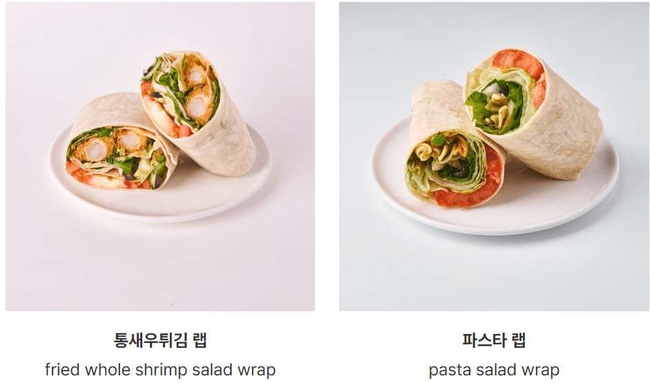 | 통새우튀김 랩 | 8,900 | 535 | 적채 + 또띠아 ★ 갈릭치즈 드레싱 |
