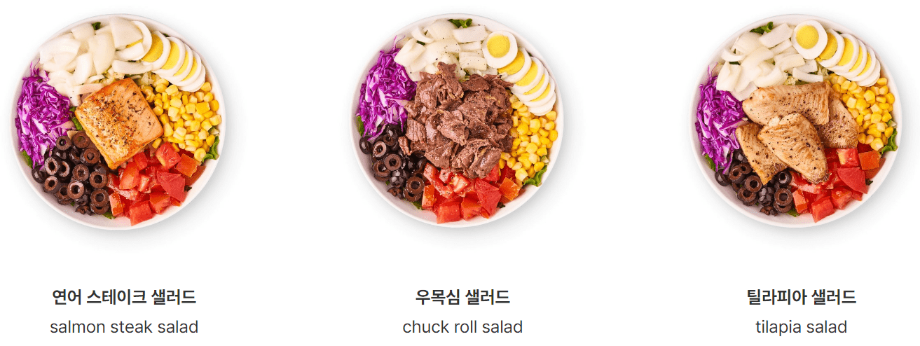 | 틸라피아 샐러드 | 12,900 | 325 | 틸라피아 + 로메인 + 양상추 + 적채 + 양파 + 오이 + 계란 + 옥수수 + 올리브 + 토마토 + 올리브오일 ★ 간장 드레싱 |