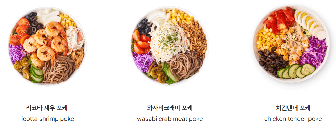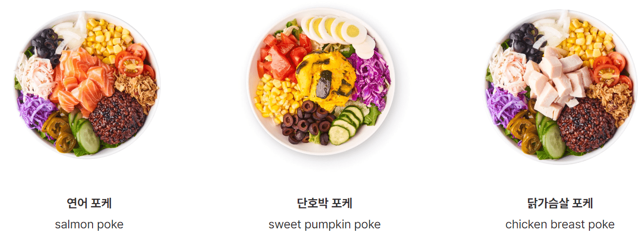 | 연어 포케 | 10,900 | 200 | 연어 + 로메인 + 양상추 + 적채 + 오이 + 양파 + 토마토 + 할라피뇨 + 크래미 + 올리브 + 흑미보리밥 or 메밀면 ★ 이탈리안 드레싱 |