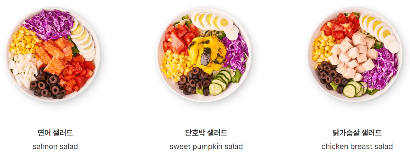 | 닭가슴살 샐러드 | 7,900 | 190 | 닭가슴살 + 로메인 + 양상추 + 적채 + 오이 + 계란 + 토마토 + 올리브 ★ 오리엔탈 드레싱 |