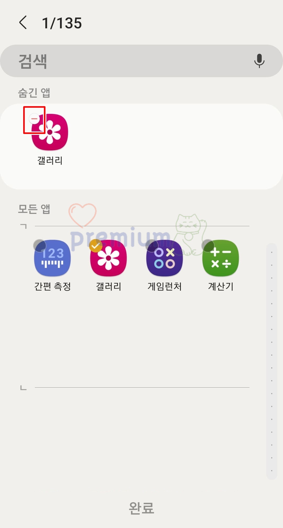 숨긴 앱 항목에 선택한 앱이 표시되어 있으며, 선택한 앱이 표시된 것을 확인한 후 완료 버튼을 클릭하시면 됩니다.