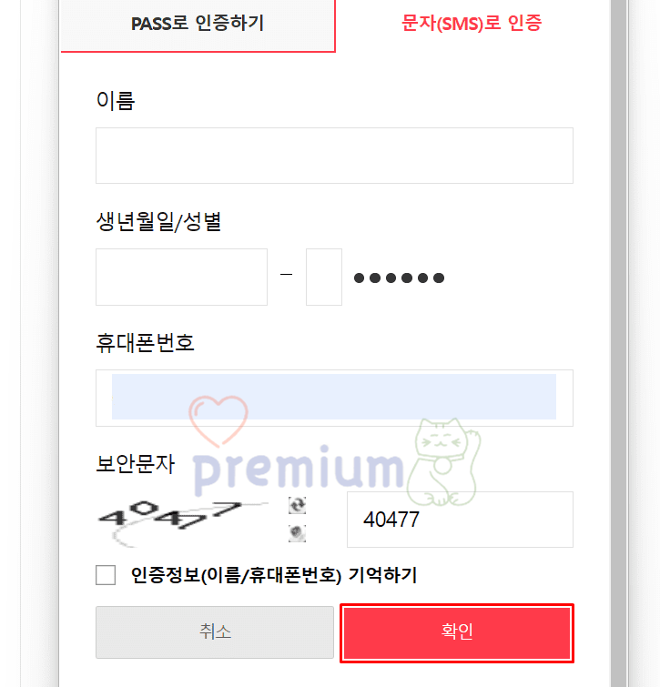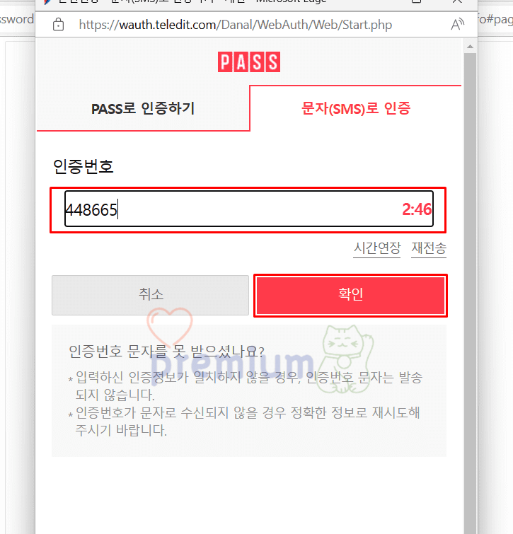 ⑧ SMS으로 전송된 인증번호를 입력합니다.