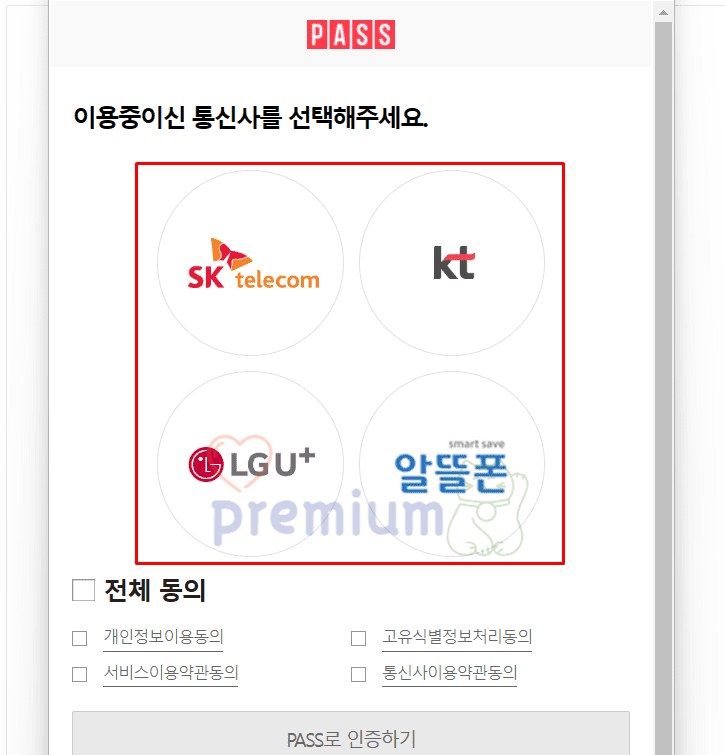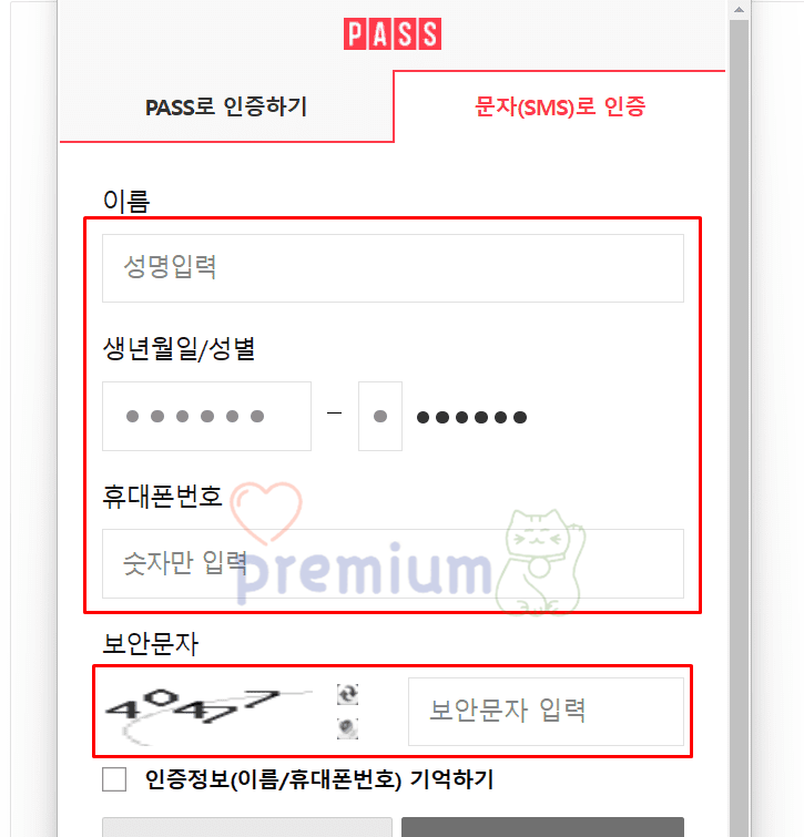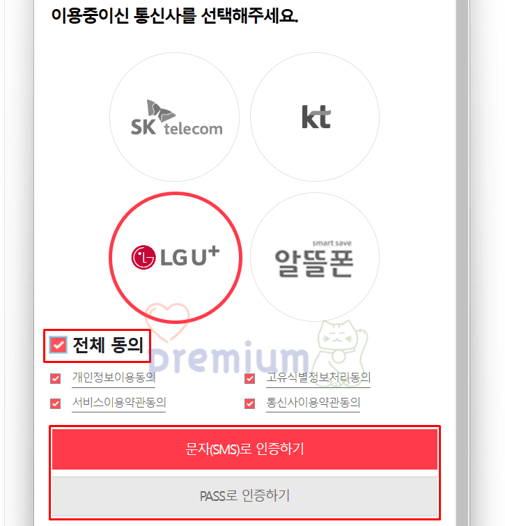 ④ 문자로 인증 또는 PASS로 인증 중 원하는 인증수단을 선택합니다.