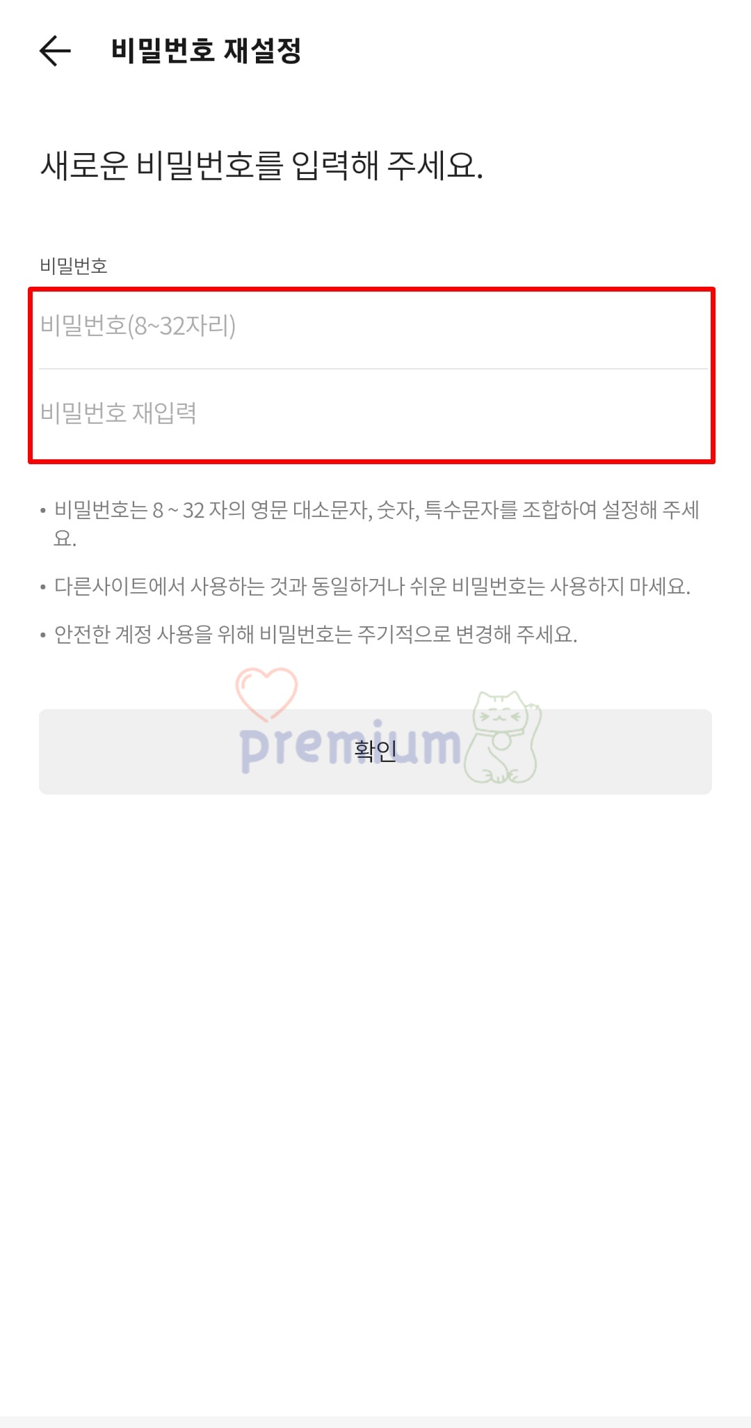 8. 8 ~ 32자의 영문 대소문자, 숫자, 특수문자를 조합하여 새 비밀번호를 입력합니다.