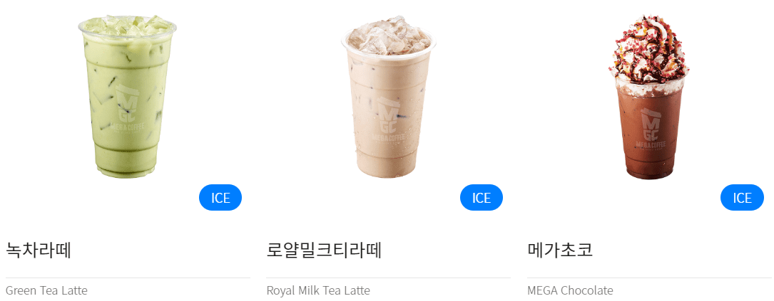 | 메가초코 HOT / ICE | 3,800 | 507.0 / 397.2 | 우유 + 초코소스 + 휘핑크림 |