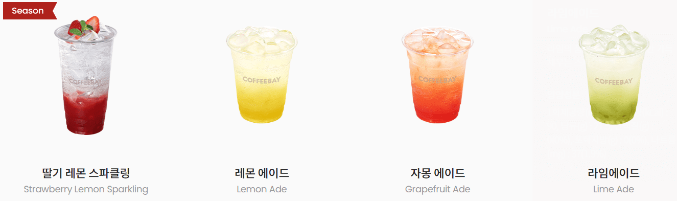 | 딸기 레몬 스파클링 | 5,100 | 142.8 | 딸기 + 레몬 + 에이드 |