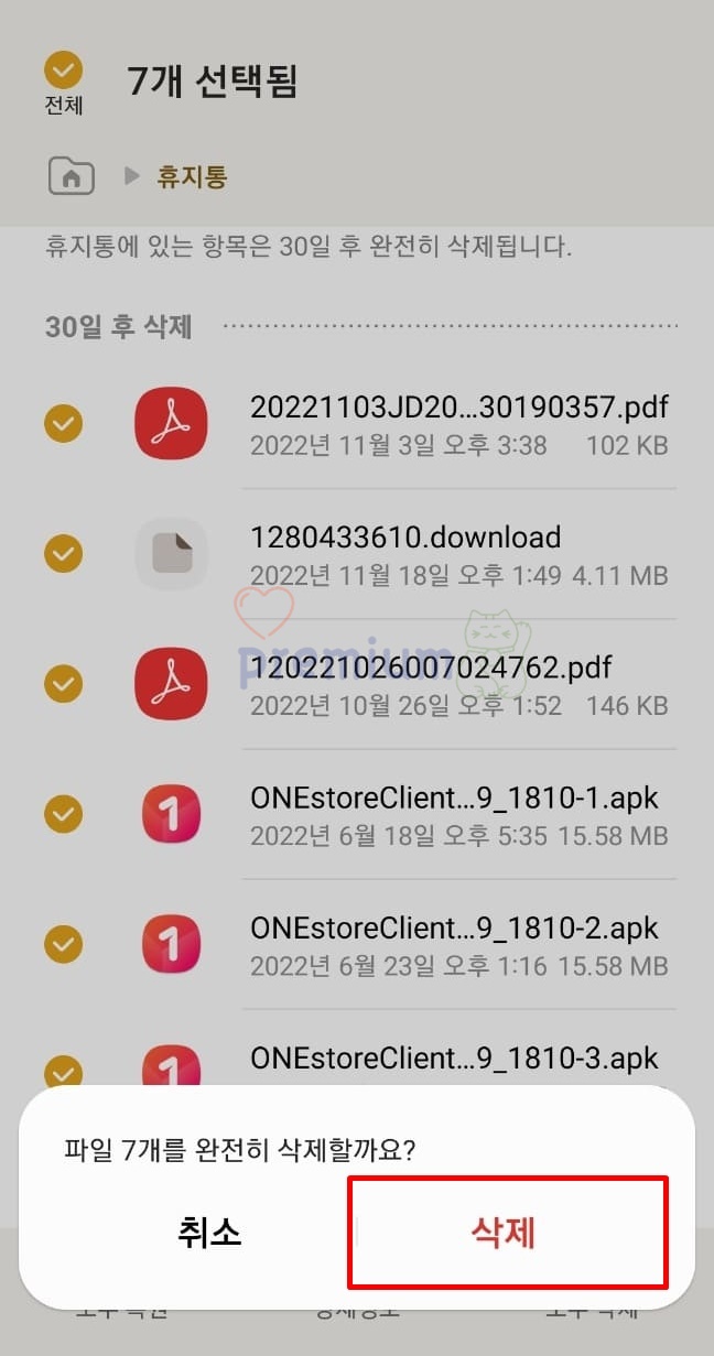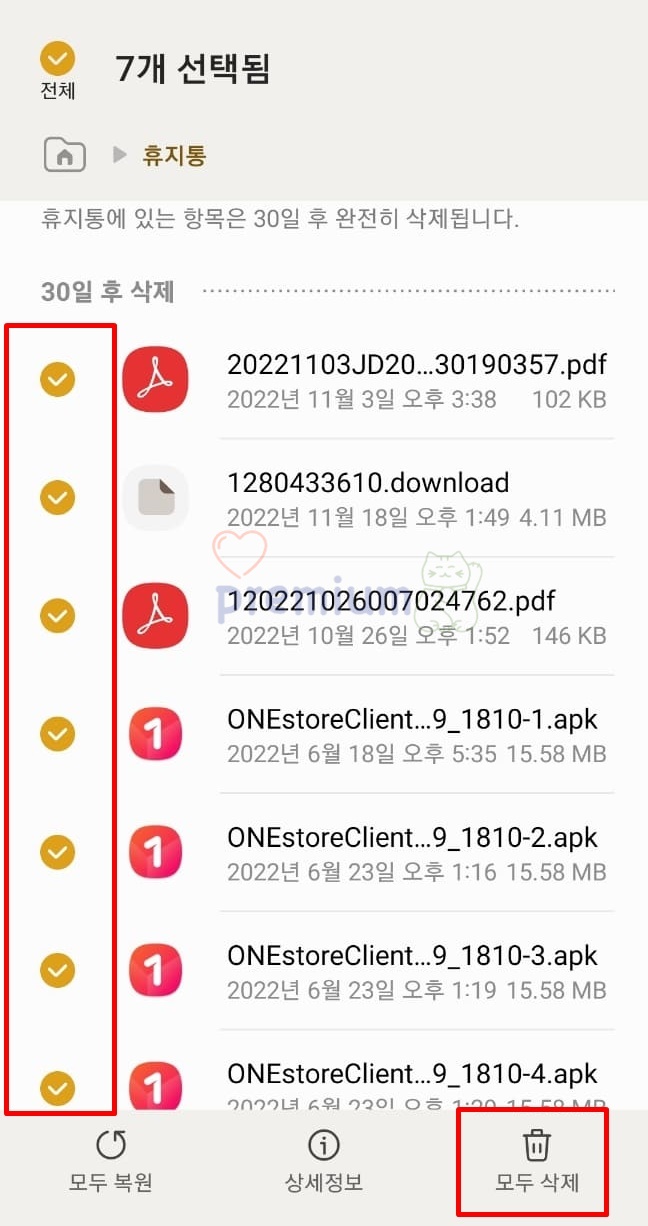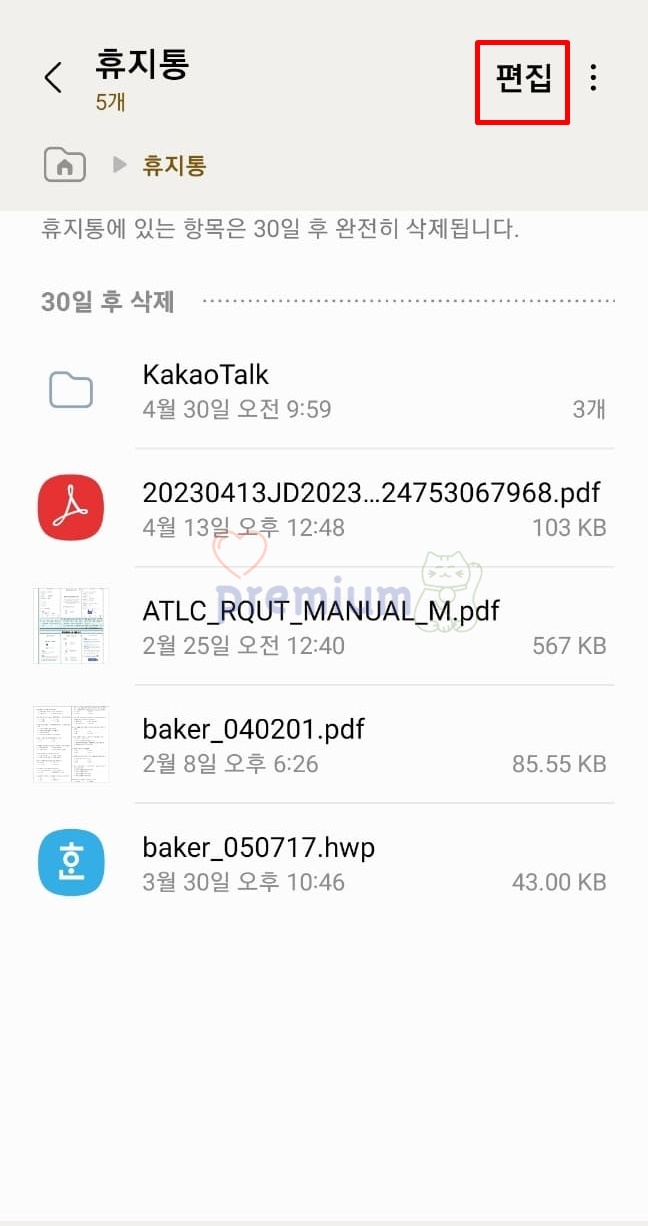 하지만 가끔가다 실수로 중요한 파일을 삭제하거나 휴대폰이 오작동하여 파일이 손실되는 경우가 있을 겁니다. 삭제된 파일은 복구가 가능하지만, !내 파일 앱에서 삭제된 파일만 휴지통에 30일 동안 보관이 되어서 복구!를 할 수 있습니다. !30일이 지나면 영구적으로 삭제!가 됩니다. 혹시라도 내 파일 앱에서 삭제된 파일을 복구하고 싶으신 분들은 아래 방법을 참고하시기 바랍니다. 그리고 추가로 휴지통에 보관된 파일을 모두 삭제할 수 있으니 원하시는 분들은 참고하시면 됩니다.