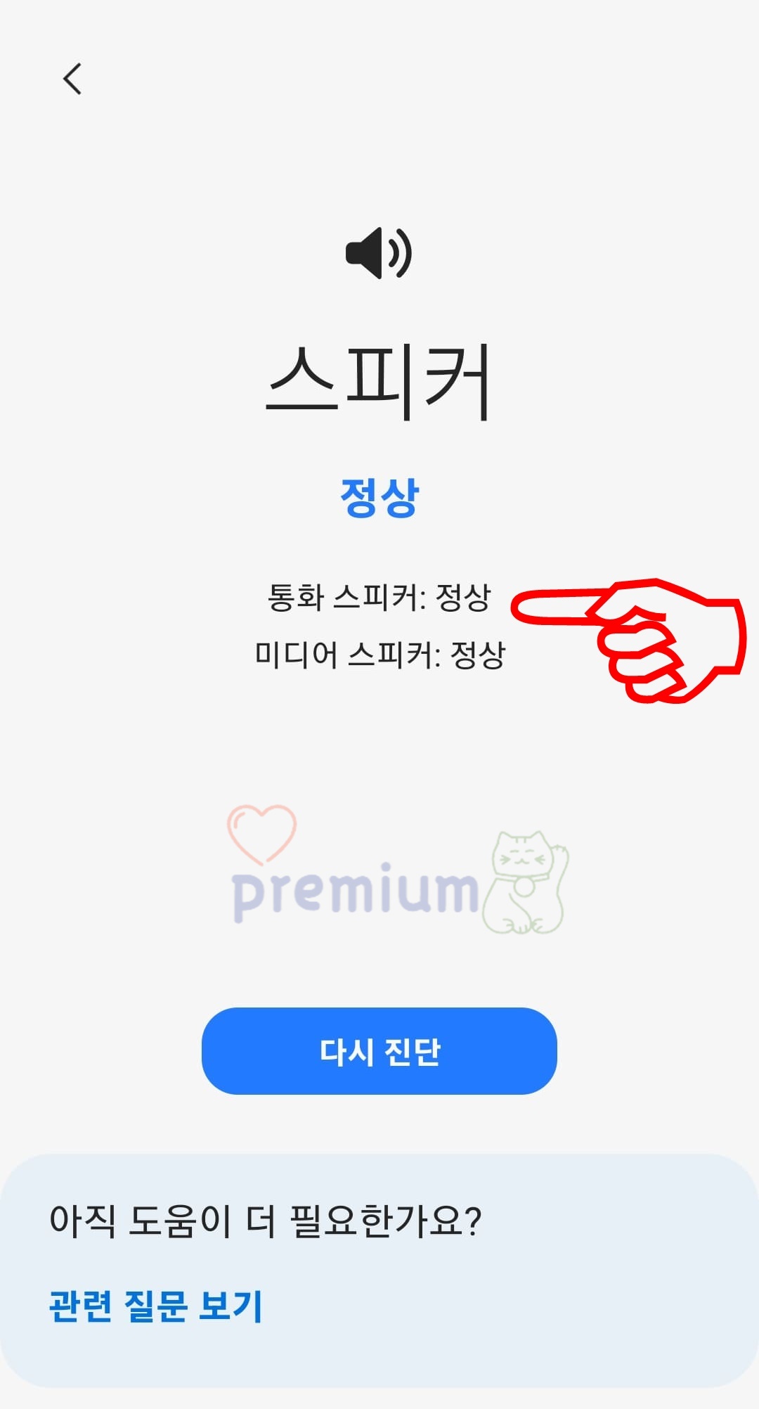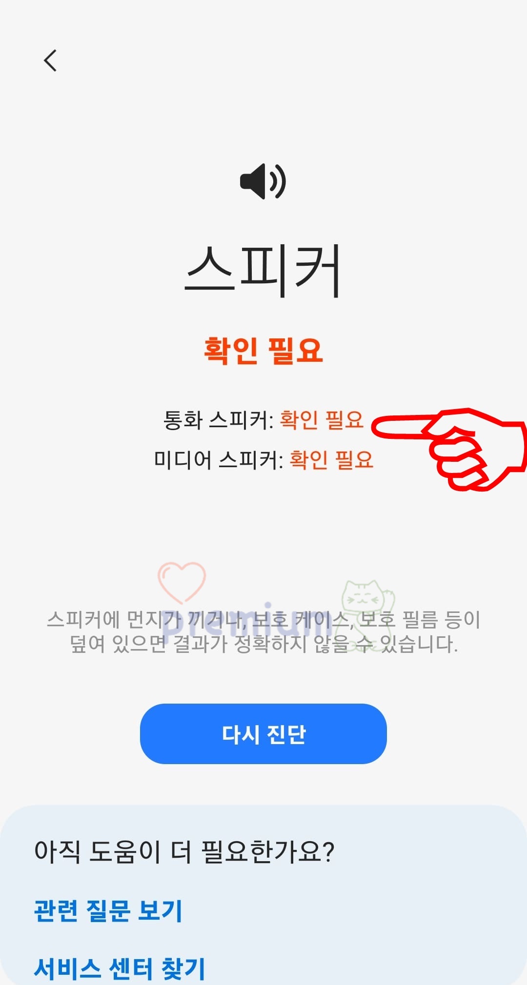 10. 통화 스피커와 미디어 스피커 결과가 나옵니다. 스피커에 아무 이상이 없다면 왼쪽 사진처럼 정상으로 표시됩니다. 반면에 스피커에 문제가 있다면 오른쪽 사진처럼 확인 필요 문구가 표시됩니다. 하지만 정상임을 불구하고 소리가 나지 않다면 휴대폰 설정을 잘 못 건드릴 확률이 높습니다.