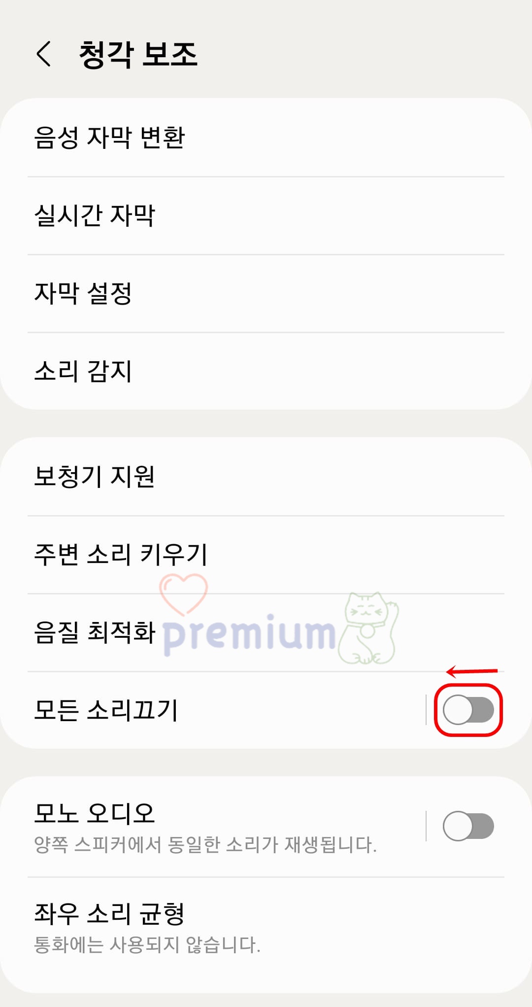 3. 모든 소리끄기 버튼이 활성화되어 있다면 버튼을 클릭하여 비활성화로 바꿔줍니다.
