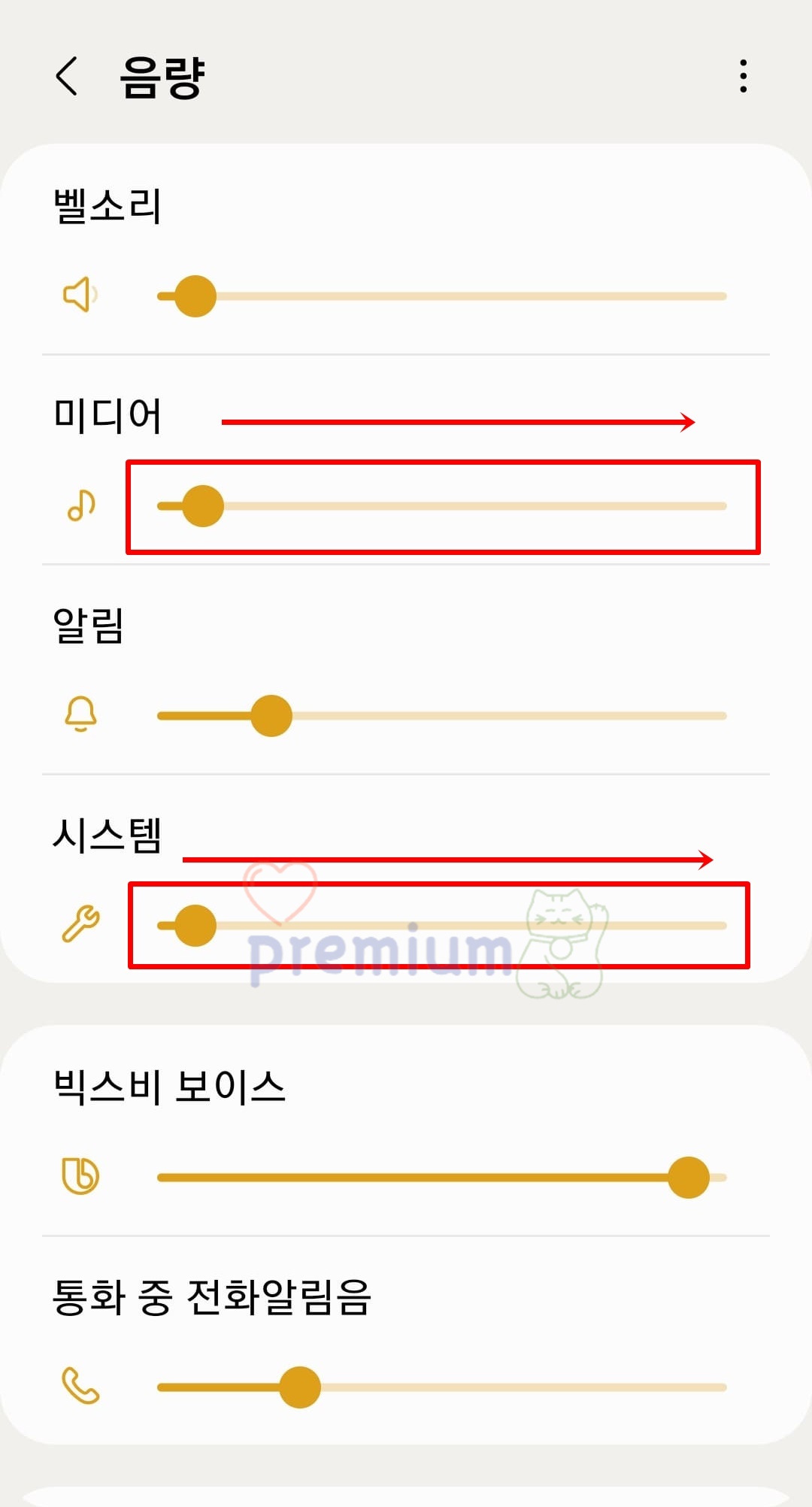 3. 미디어 음량과 시스템 음량을 오른쪽으로 최대로 높입니다.
