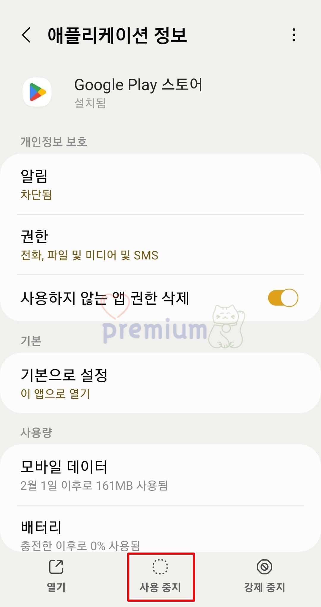 3. 앱 사용 중지 버튼을 클릭합니다.