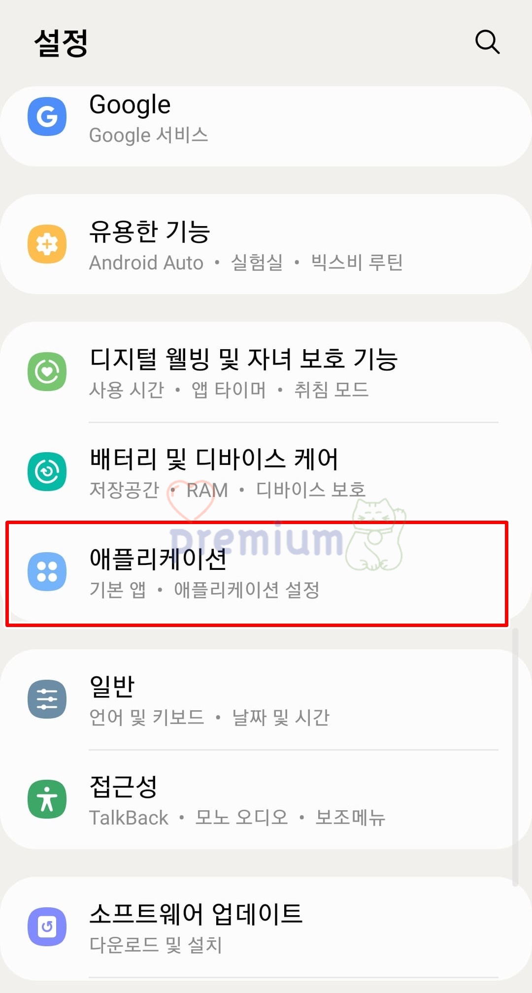 1. 설정 앱 > 애플리케이션 탭을 클릭합니다.