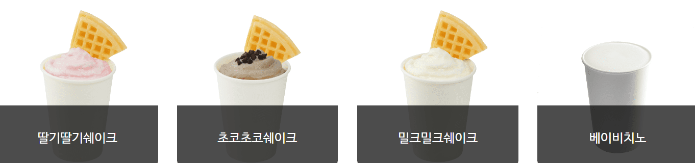 | 초코초코 쉐이크 | 4,200 | 486 | 바닐라 아이스크림 + 초코 + 우유 |