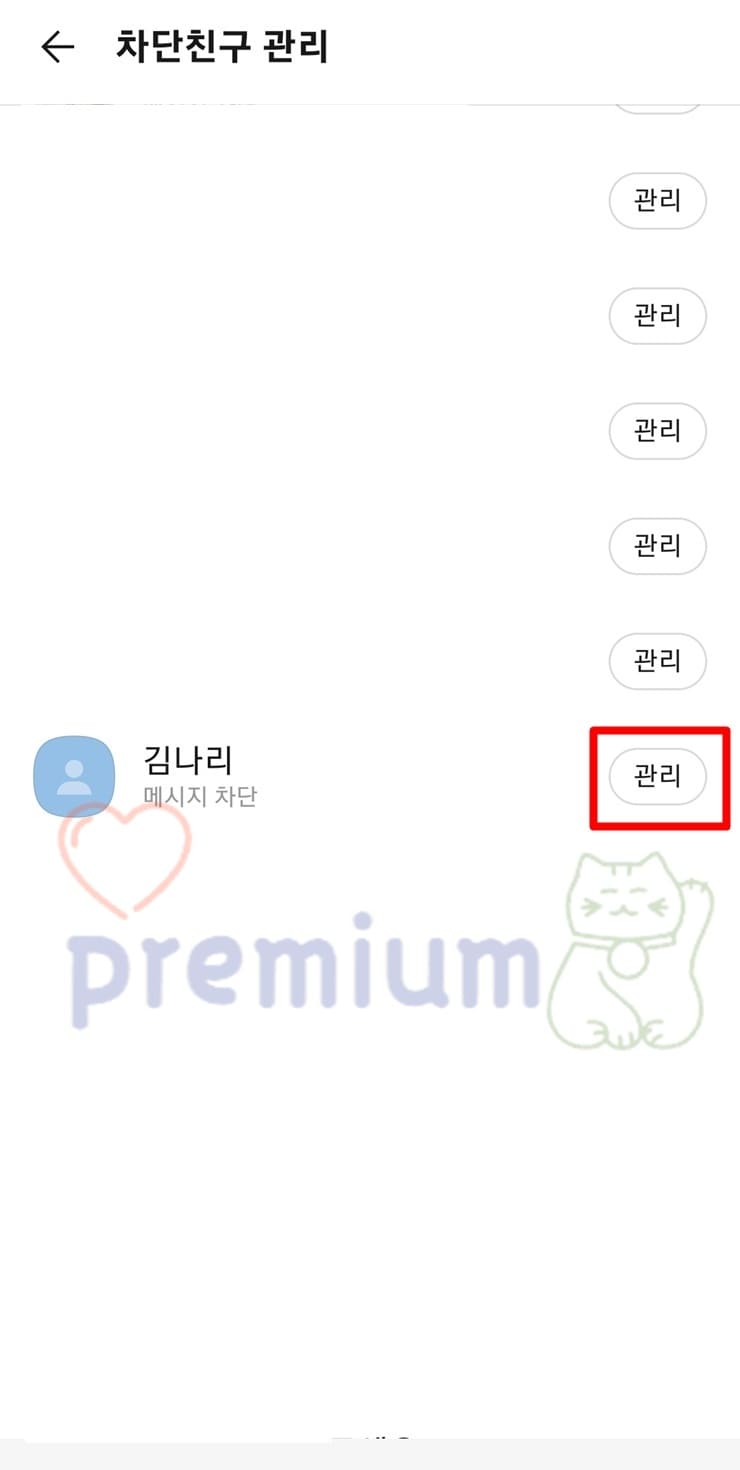 4. 차단된 친구 중 차단 해제를 하려는 친구 > 관리 탭을 클릭합니다.