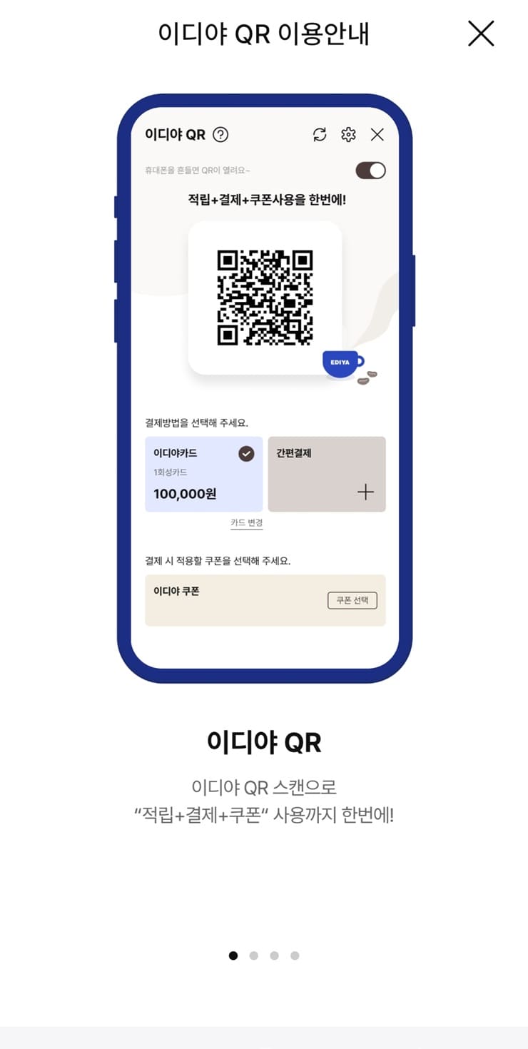 이디야카드와 기프트카드 그리고 간편결제 (이디야페이, 페이코 등)를 이디야QR에 적용하여 매장결제 시 사용가능하며, 쿠폰의 경우에는 최대 5개까지 적용이 가능합니다.