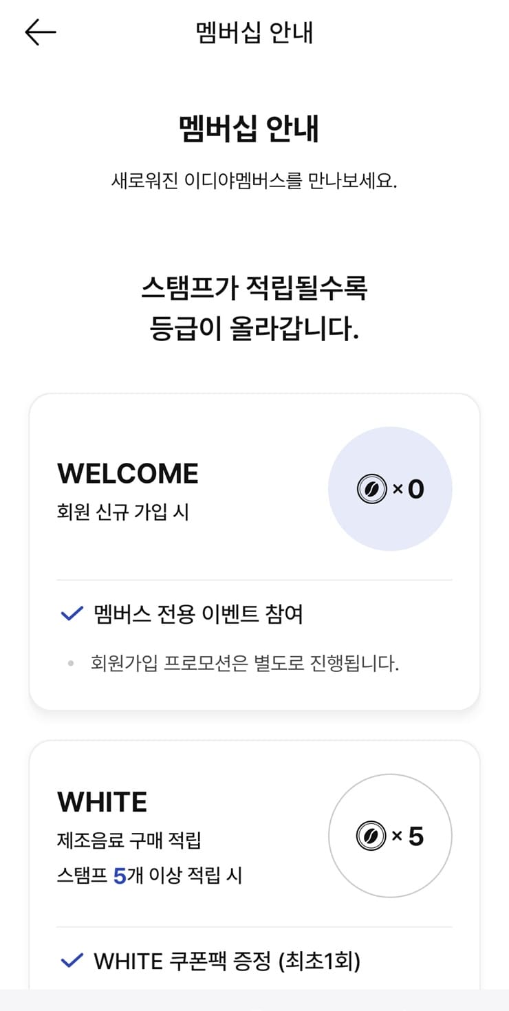 Blue등급 이전 (Welcome 및 White등급)은 등급달성 스탬프가 적립되며, 등급 달성기준이 충족되면 다음날 승급과 함께 등급 달성스탬프가 차감됩니다. Blue등급 이후부터는 적립되는 스탬프는 사용가능한 스탬프로 적립되어, 스탬프쿠폰 교환 및 이벤트 참여에 사용할 수 있습니다. 그리고 APP 이벤트, E-미션, 이디야소식 등 리워드컨텐츠를 통해 Welcome 및 White 등급도 사용가능한 스탬프를 적립할 수 있습니다.