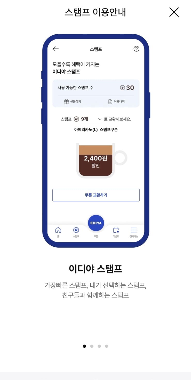 - 스탬프 9개 사용 = 아메리카노(L) 스탬프쿠폰 2,400원 할인