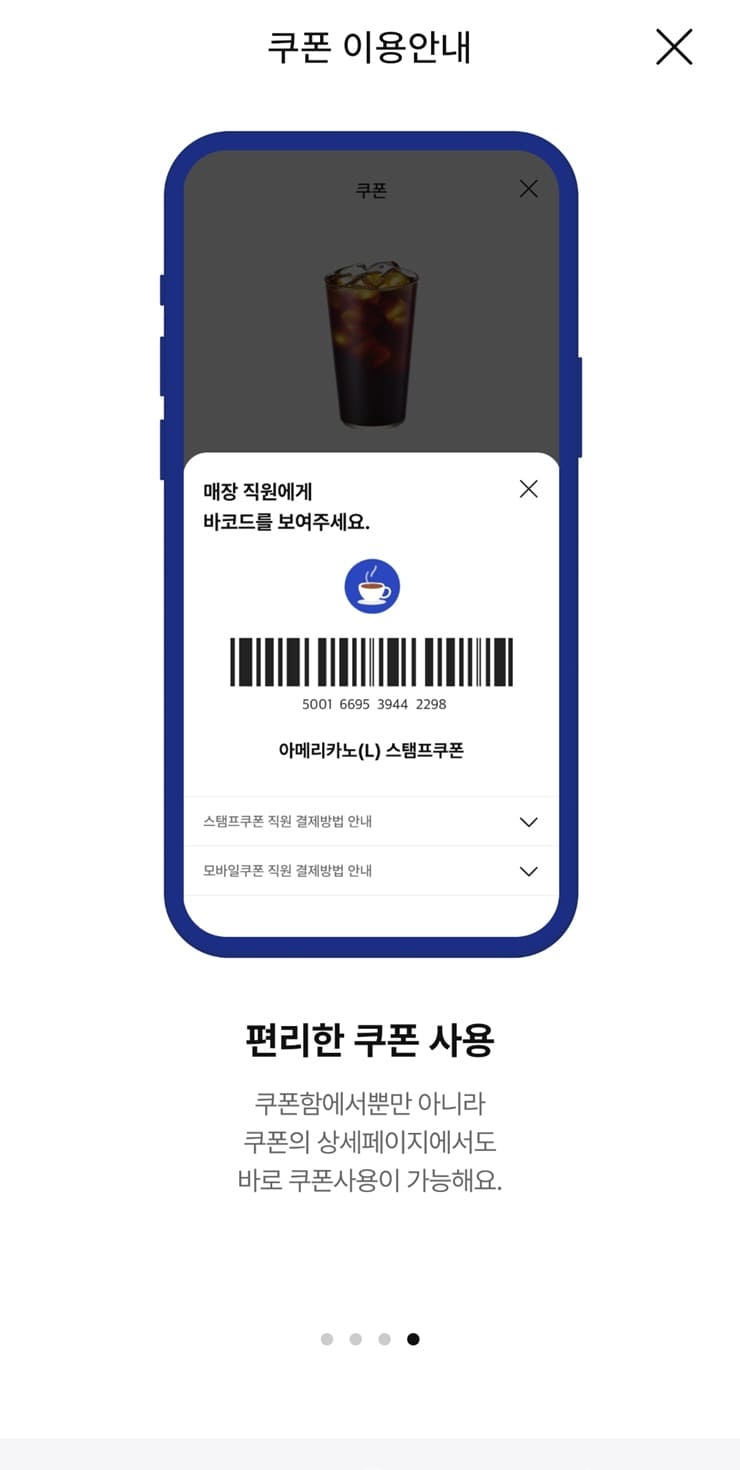 - 스탬프쿠폰 : 스탬프를 사용하여 아메리카노(L) 할인쿠폰 및 무료쿠폰으로 교환가능한 쿠폰입니다.