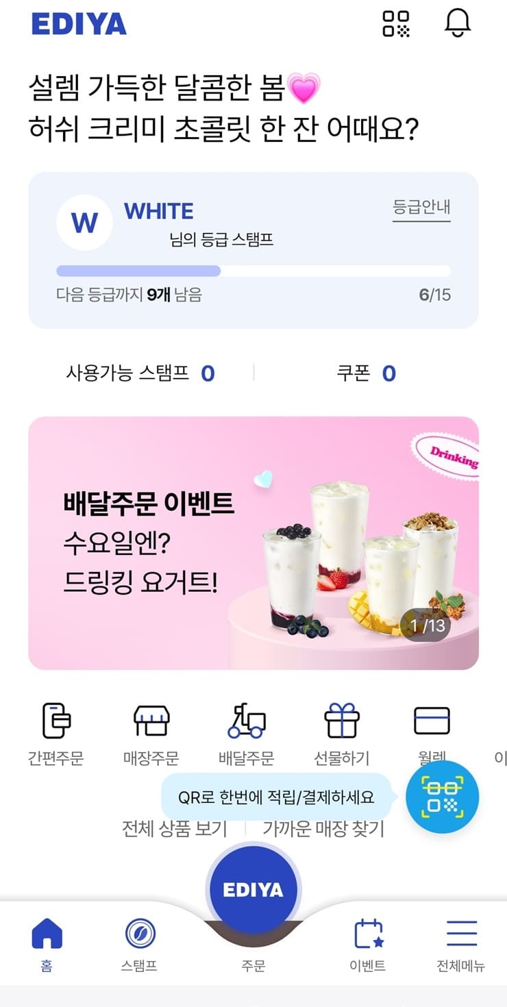 이디야QR을 통해 매장에서 제조음료를 구매하거나, APP 주문하기 서비스 (배달주문/매장주문)을 통해 제조음료를 구매 시 스탬프 적립이 가능합니다.