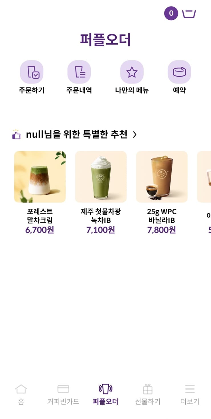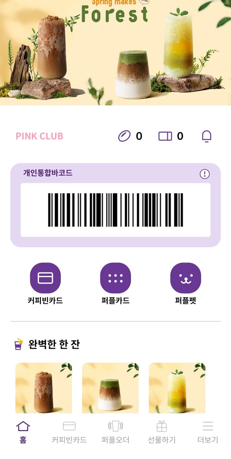 [커피빈 어플 > 퍼플카드]를 통해 적립된 스탬프 확인이 가능합니다.