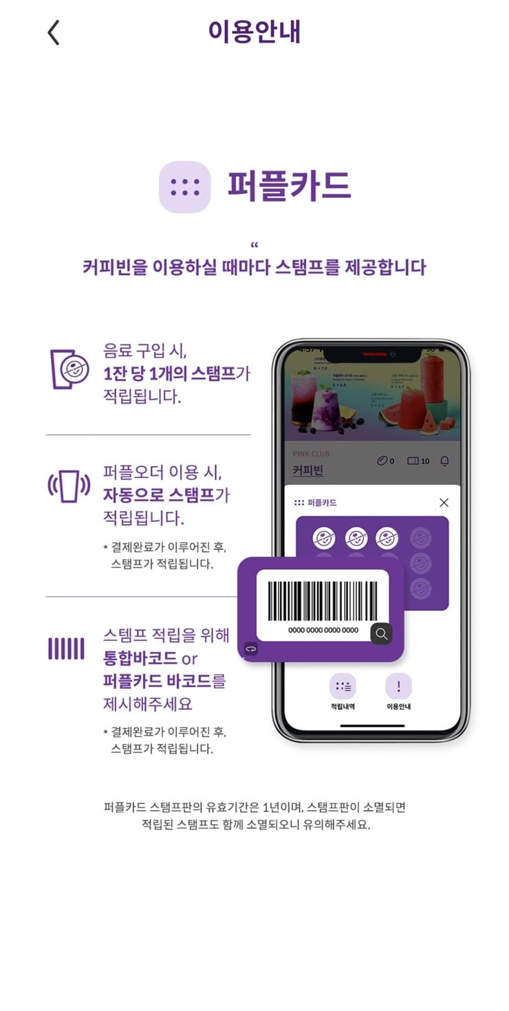 퍼플카드의 유효기간은 판의 첫 스탬프를 적립한 날로부터 1년입니다. 유효기간 경과 시 적립된 스탬프도 함께 소멸되니 유의해 주세요.
