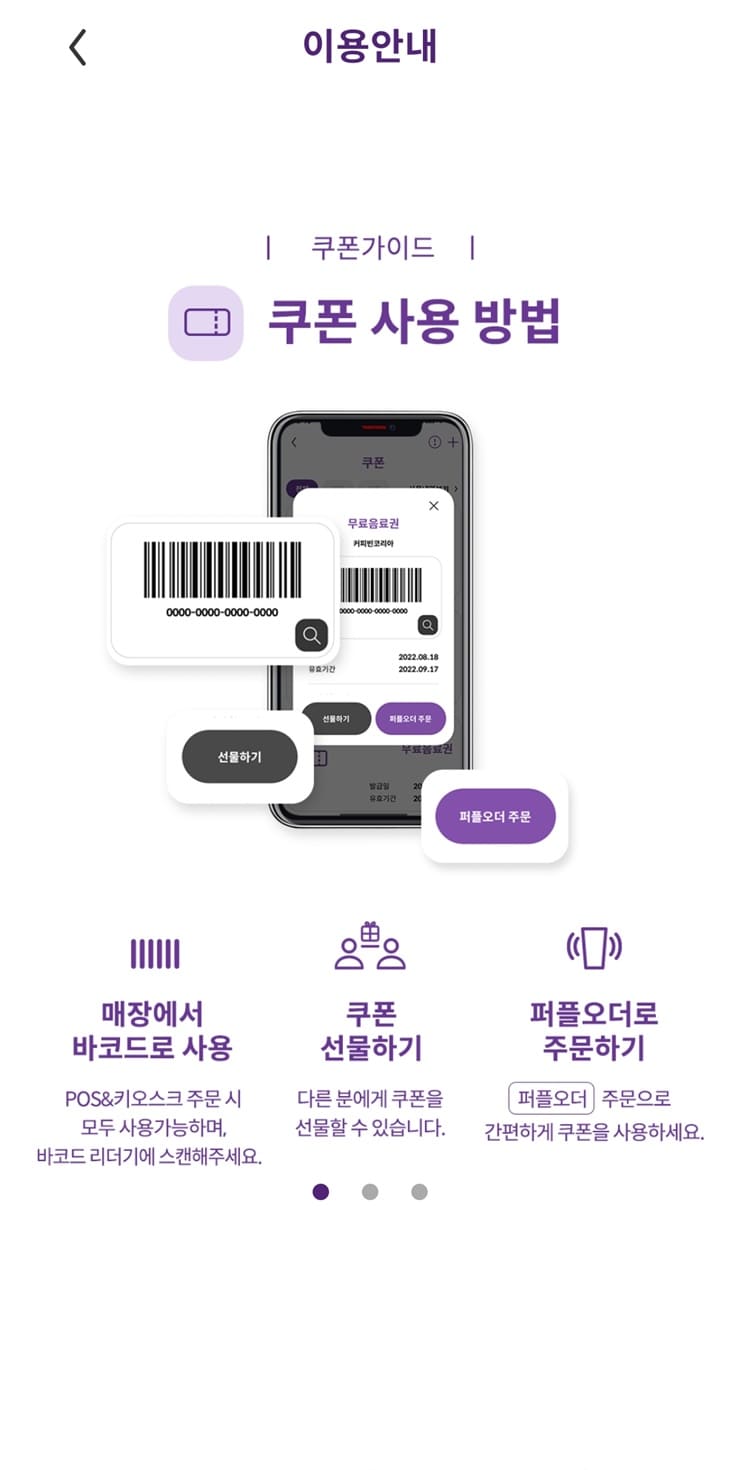 [커피빈 어플 > 퍼플카드 > 유효기간]을 통해 퍼플카드의 유효기간 확인이 가능합니다.