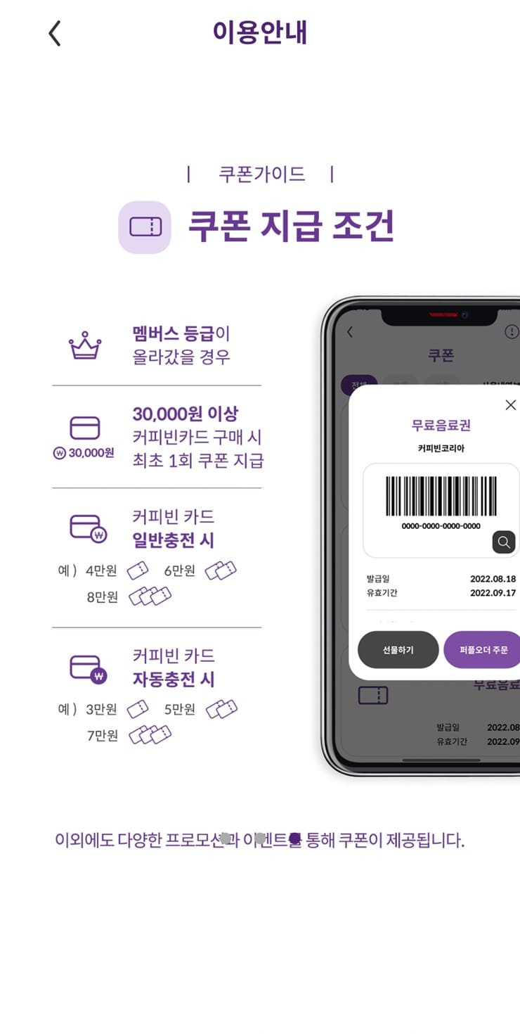 커피빈 어플에서 카드 충전 시 충전 금액에 따라 무료음료쿠폰이 지급되고 있습니다.