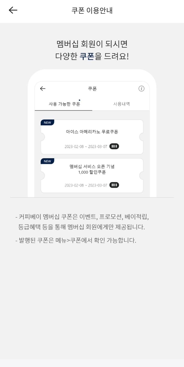 커피베이 멤버십 쿠폰은 커피베이 매장 및 베이오더에서 사용 가능합니다. 매장에서 메뉴를 주문하기 전 [쿠폰 > 사용 가능한 쿠폰]에서 사용하실 쿠폰의 바코드 및 쿠폰번호를 제시해주세요.