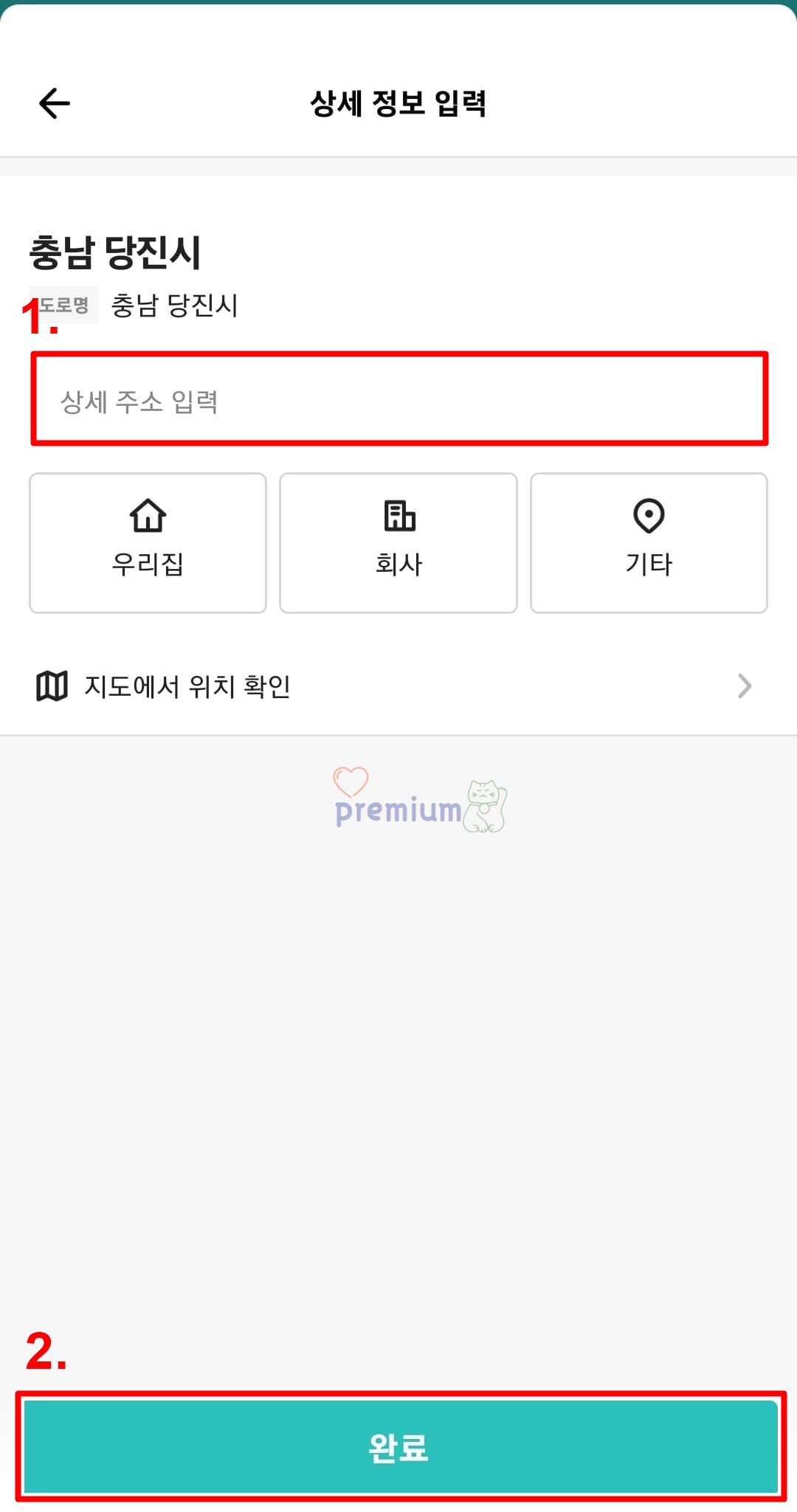 상세 주소는 동수나 호수 등 자세한 주소를 입력하시면 됩니다. 그리고 특히 변경한 주소로 자주 사용을 하실 거면 우리집, 회사, 기타로 등록하시면 됩니다.