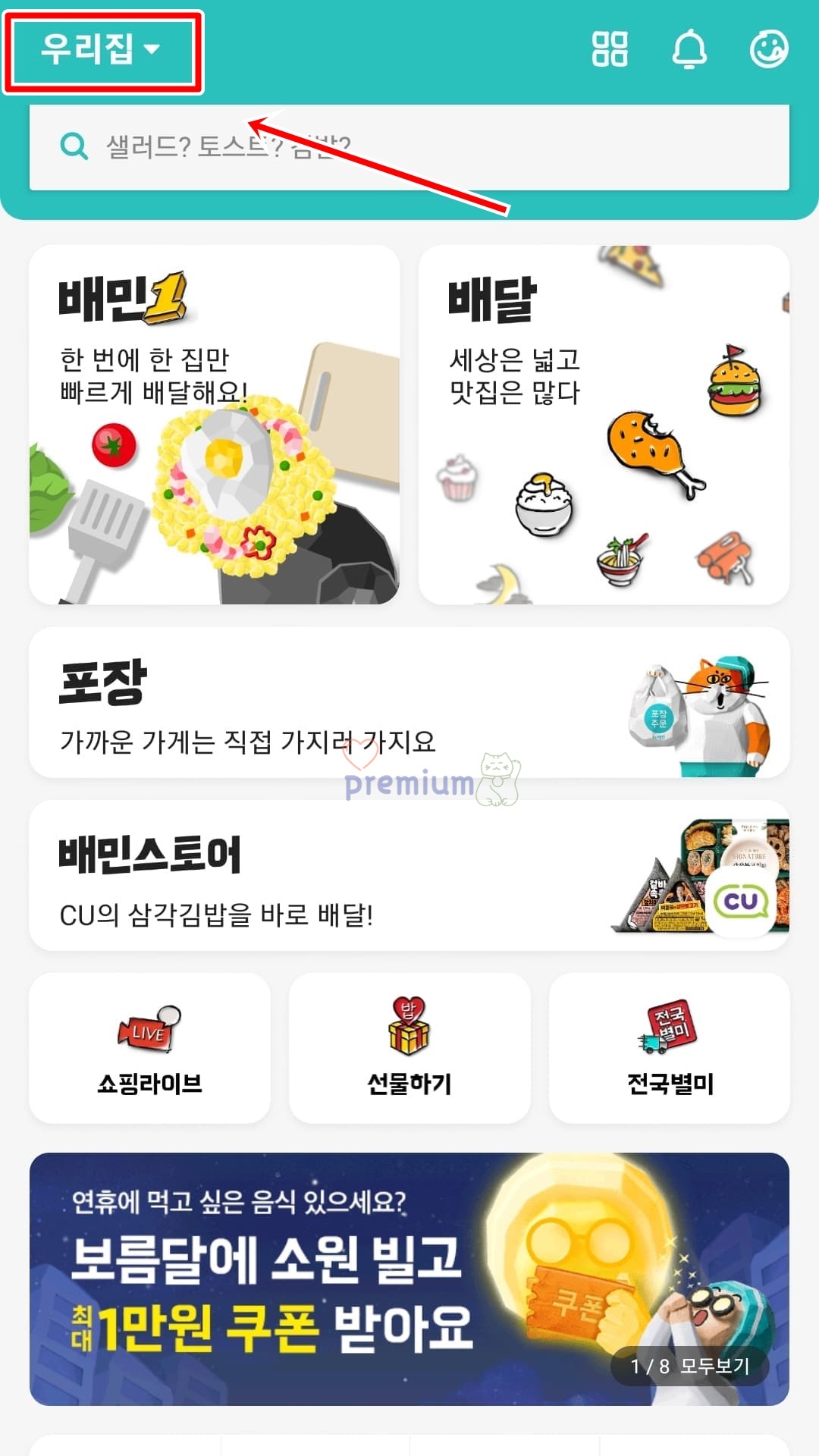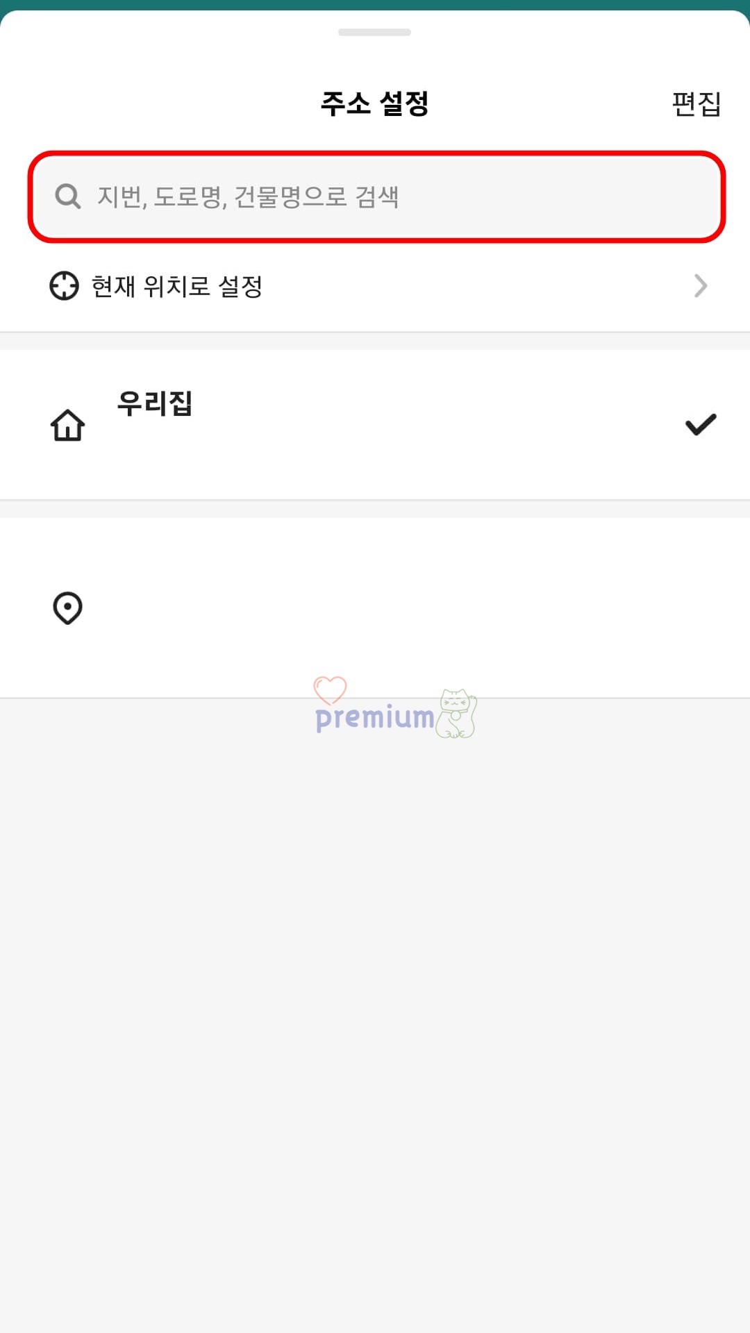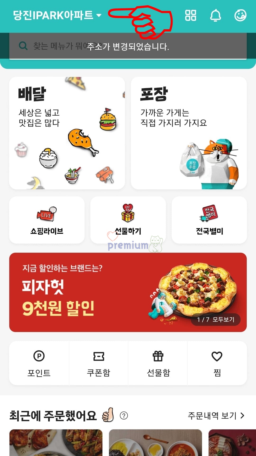 배달의 민족 메인 화면으로 돌아가시면 왼쪽 위 측에 변경된 주소를 확인하실 수 있습니다.