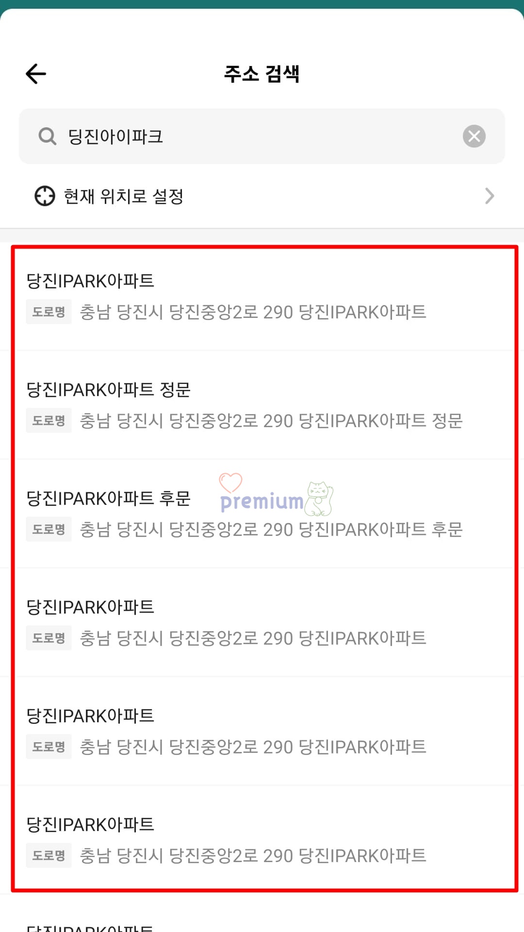 주소를 입력한 후 검색하시면 여러 주소 목록이 나옵니다. 주소 목록 중에 원하시는 주소를 클릭하시면 됩니다.